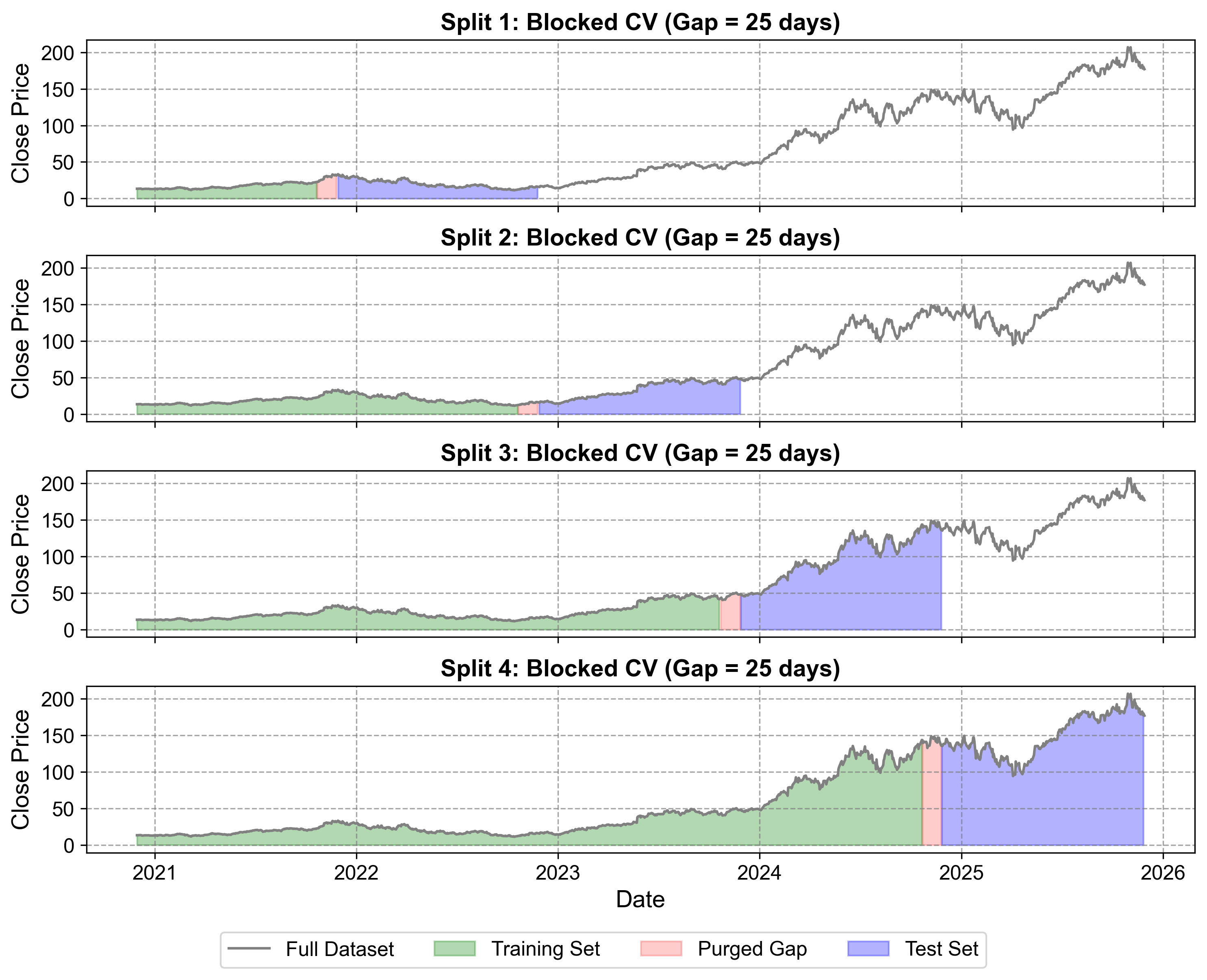 Fig. 1.5 Blocked (Purged) Cross-Validation for NVIDIA stock price data (2020-2025). This visualization demonstrates the critical concept of temporal gaps in time series validation. Training sets (green) grow over time but are separated from test sets (blue) by purged gaps (red) that prevent data leakage from autocorrelation. The 25-day gaps ensure that temporal dependencies between consecutive observations don’t artificially inflate model performance estimates. This method provides more realistic performance estimates for financial time series where price movements exhibit strong serial correlation.#