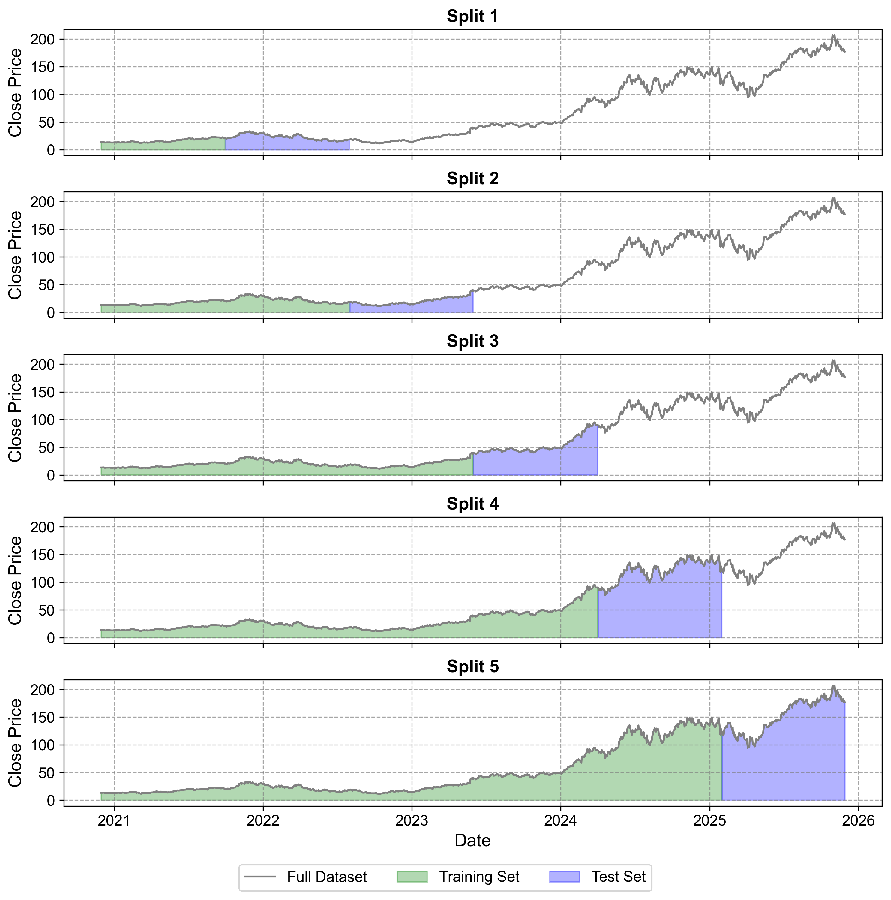 The NVIDIA example below demonstrates these concepts in action, showing how each split builds upon previous knowledge while testing the model’s ability to generalize to future periods.