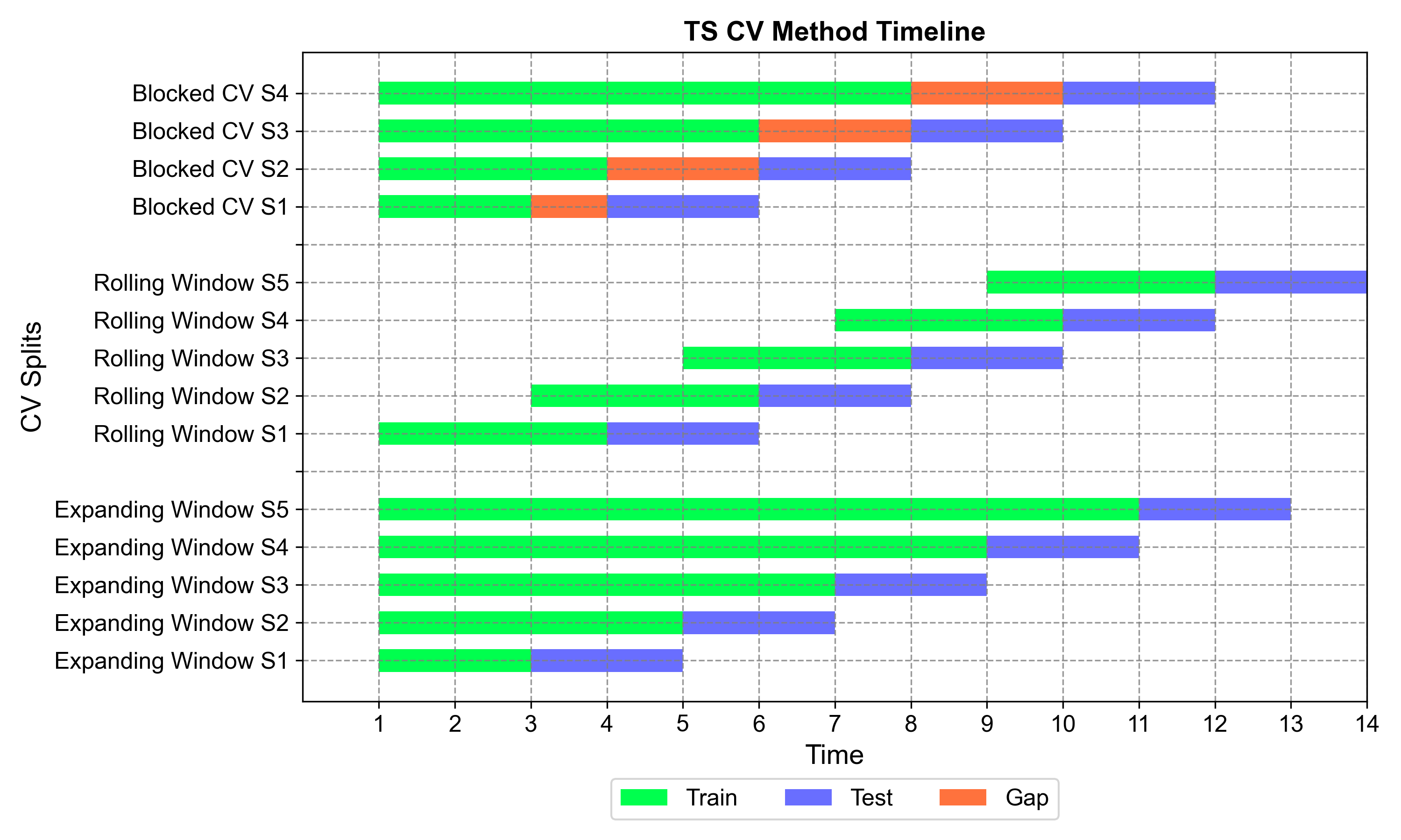 Fig. 1.2 Timeline comparison of three time series cross-validation methods. The visualization shows how each method handles training data (green), test data (blue), and gaps (orange) across multiple splits over time. Expanding window grows training sets progressively, rolling window maintains fixed training sizes, and blocked CV introduces purged gaps to prevent data leakage.#