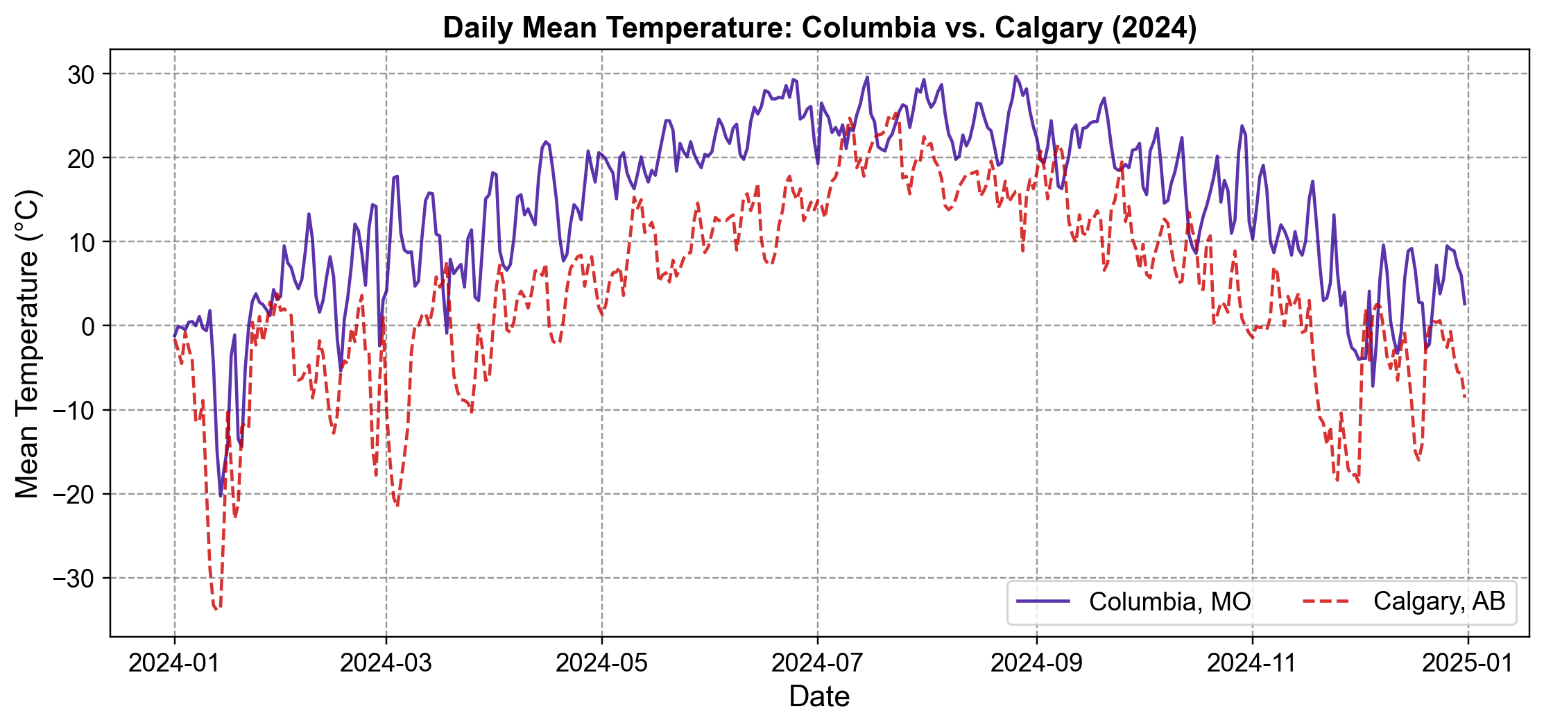 Before diving into mathematical metrics, it is essential to visually inspect the time series. Here, we compare the daily mean temperatures of Calgary, Canada, and Columbia, Missouri.