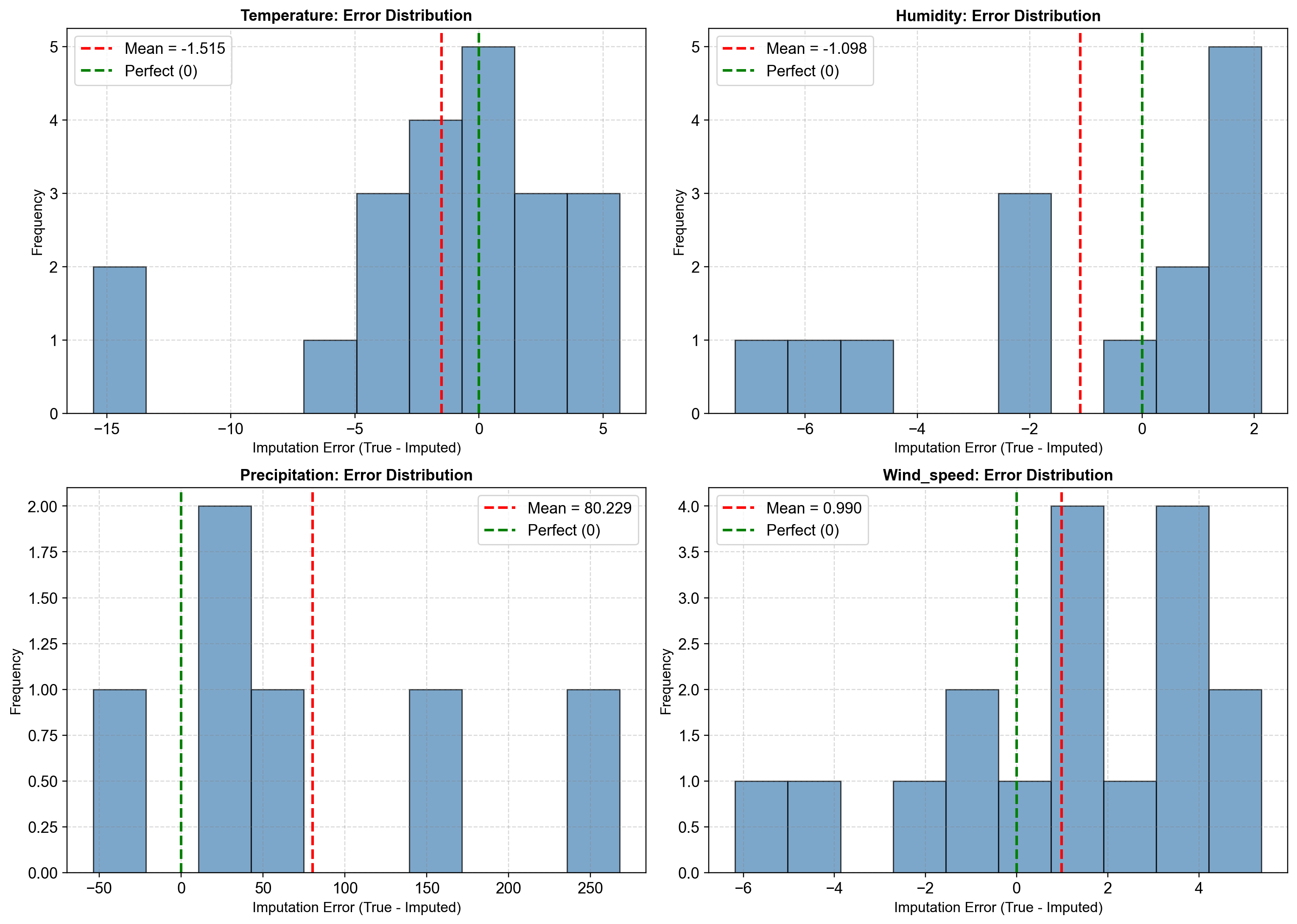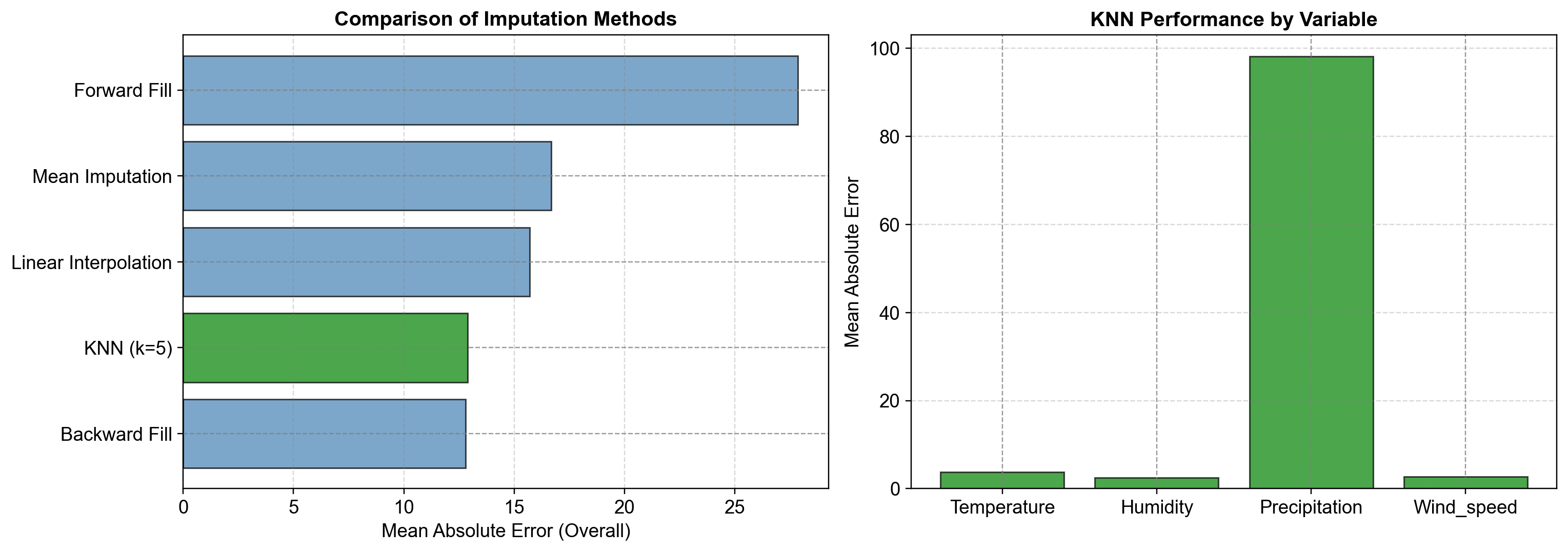 Multivariate Imputation: Uses correlations between variables (e.g., Temp & Humidity, Humidity & Precipitation) rather than just temporal patterns