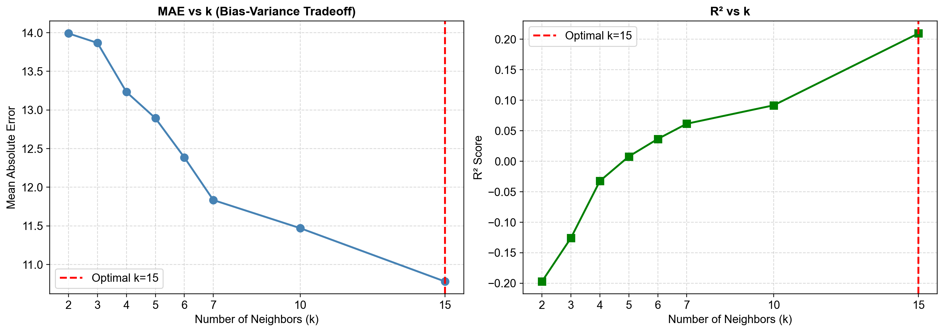 Right Panel: R² score increases monotonically with k, from negative values at k=2-4 (worse than predicting the mean) to R²=0.209 at k=15. This indicates that the multivariate neighbor-matching becomes increasingly effective as k grows, capturing more of the variance explained by the feature relationships.