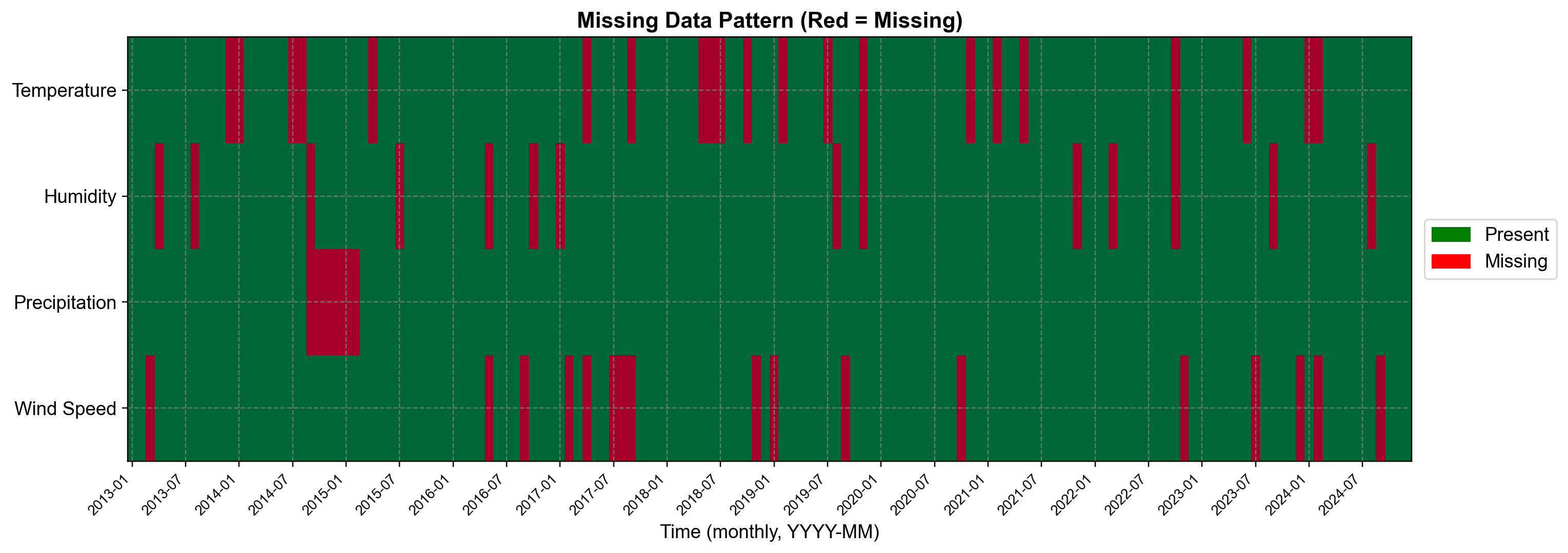 Random Missing Data (Temperature & Humidity): Simulates sporadic sensor malfunction or data transmission failures. These occur randomly across the 12-year period with no seasonal bias, typical of instrument drift or power interruptions.