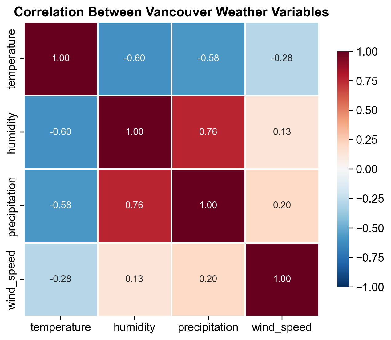 Fig. 2.15 Correlation matrix of Vancouver weather variables (2013-2024). Strong negative correlation between temperature and humidity (-0.60) reflects saturation vapor pressure principles: colder air can hold less moisture. Temperature and precipitation show moderate negative correlation (-0.58), a seasonal effect where cold months have different precipitation regimes. Humidity and precipitation are strongly positively correlated (0.77), indicating that humid atmospheric conditions precede rainfall events.#