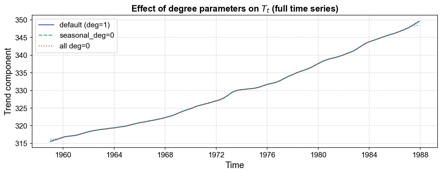 Setting seasonal_deg=0 produces a more rigid, stepwise seasonal pattern, while trend_deg=0 creates a more piecewise-constant trend. Degree 1 (default) provides smoother, more adaptive fits with better boundary behavior. For the CO₂ series, which exhibits smooth trends and stable seasonality, the choice of degree parameters makes minimal practical difference.