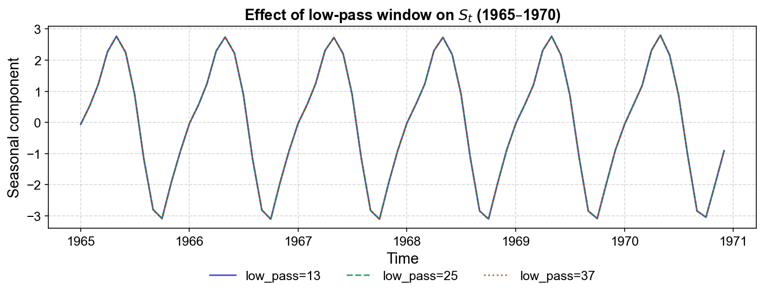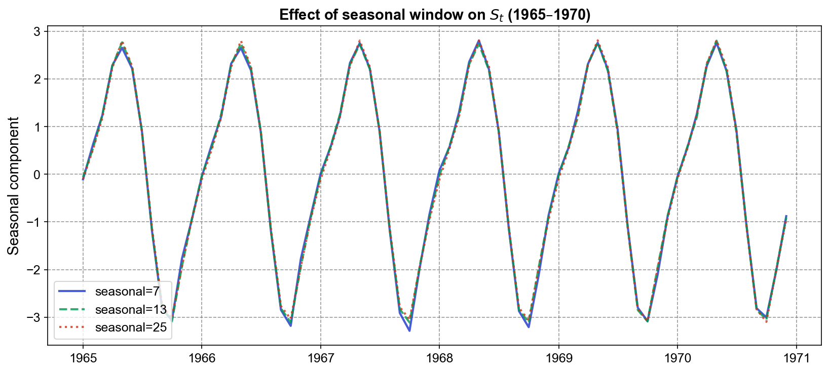 Fig. 3.8 Effect of seasonal window (seasonal=7, 13, 25) on the seasonal component \(S_t\) over 1965–1970. All three curves reveal the same characteristic annual cycle with peaks around May–June and troughs around October–November, nearly perfectly overlapping. This demonstrates that for the CO₂ series—which has a strong, stable seasonal pattern—the choice of seasonal window produces negligible visual differences in the extracted seasonal component.#