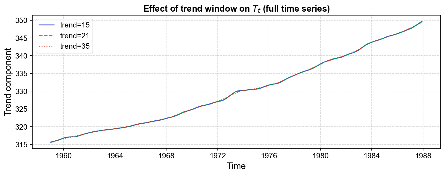 Fig. 3.9 Effect of trend window (trend=15, 21, 35) on the trend component \(T_t\) over the full 1959–1987 time series. The three curves exhibit nearly identical overall trajectories, with CO₂ levels rising steadily from ~315 ppm to ~349 ppm. Subtle differences emerge at inflection points (circa 1972–1975), where the shorter window (trend=15, solid blue) shows slightly more pronounced local curvature, while the longer window (trend=35, dotted red) enforces a smoother, more uniform acceleration. The intermediate choice (trend=21, dashed green, recommended by Cleveland et al. as ≈ 1.5 × seasonal) provides a balanced compromise.#