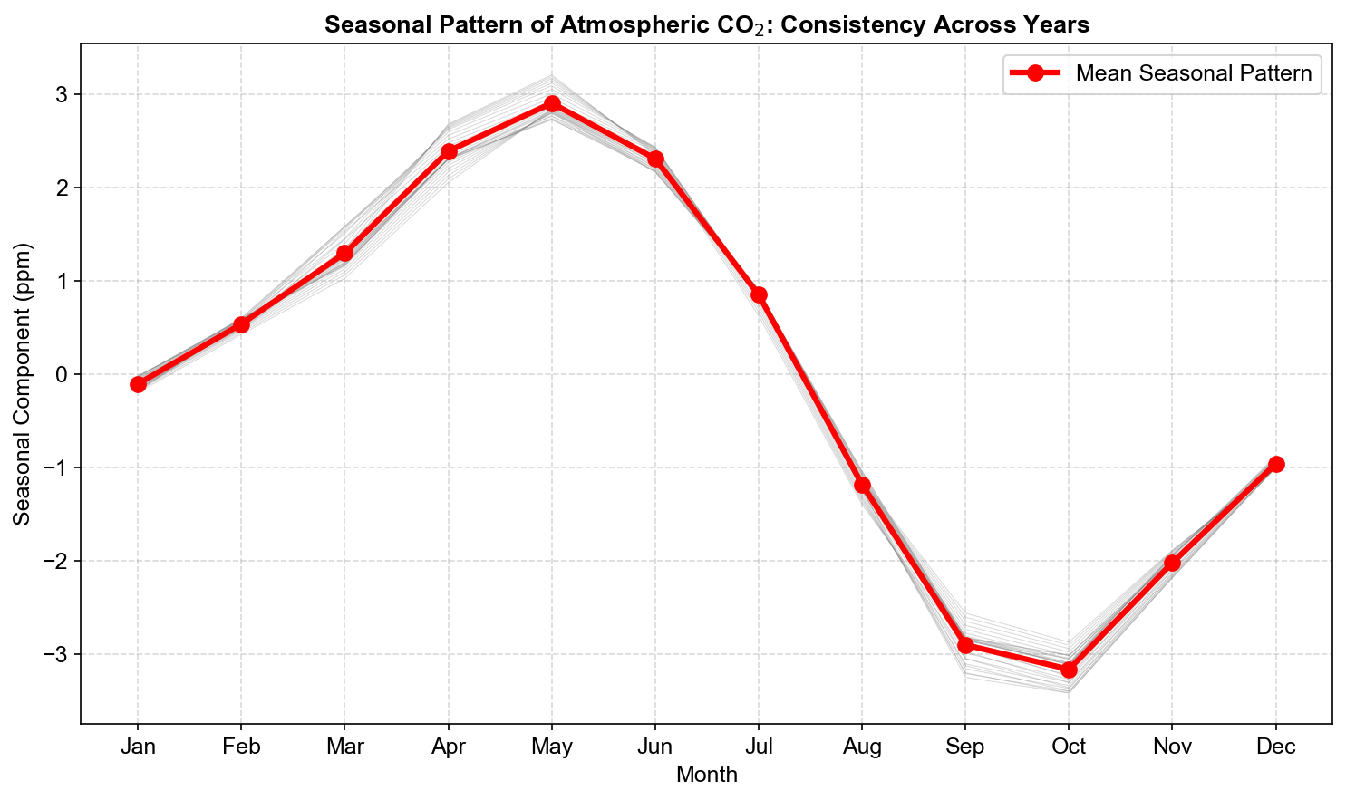 Fig. 3.7 Seasonal pattern of atmospheric CO₂ (mean STL seasonal component by calendar month). The thick red line shows the mean monthly seasonal cycle, with CO₂ peaking in late spring–early summer (May–June ≈ 2.4–3.0 ppm above the annual mean) and reaching a minimum in early autumn (September–October ≈ −2.8 to −3.2 ppm), while thin gray lines indicate that this pattern is highly consistent across years.#