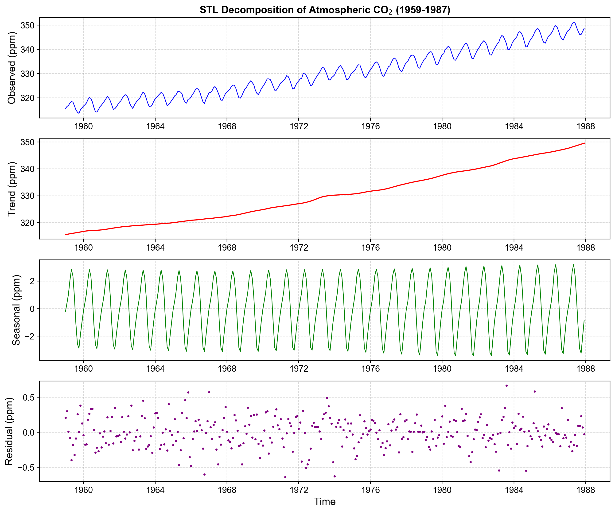 The Mauna Loa atmospheric CO₂ series (monthly, 1959–1987) is the canonical STL example from [Cleveland et al., 1990] and is included in the statsmodels STL notebook [Statsmodels Developers, 2023].