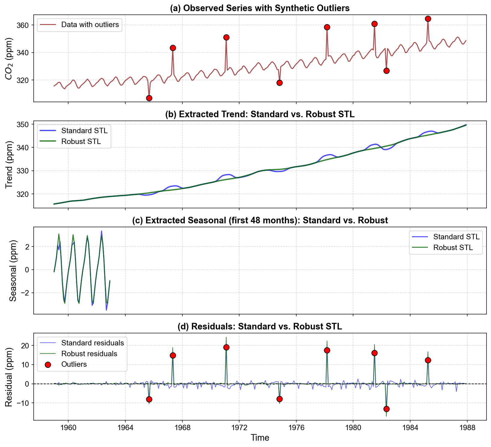 Fig. 3.19 Comparison of standard (non-robust) versus robust STL decomposition on CO₂ data with synthetic outliers. (a) Observed series with 8 outliers (red circles). (b) Trend components: Standard STL exhibits visible distortions (local bumps/dips) near outlier locations, while robust STL maintains smooth trend continuity. (c) Seasonal patterns (first 48 months): Standard STL shows irregular seasonal shapes where outliers appear; robust STL preserves consistent seasonal structure. (d) Residuals: Standard STL produces elevated residuals not only at outlier locations but also in neighboring points (contamination effect). Robust STL isolates large residuals exclusively at outlier positions.#