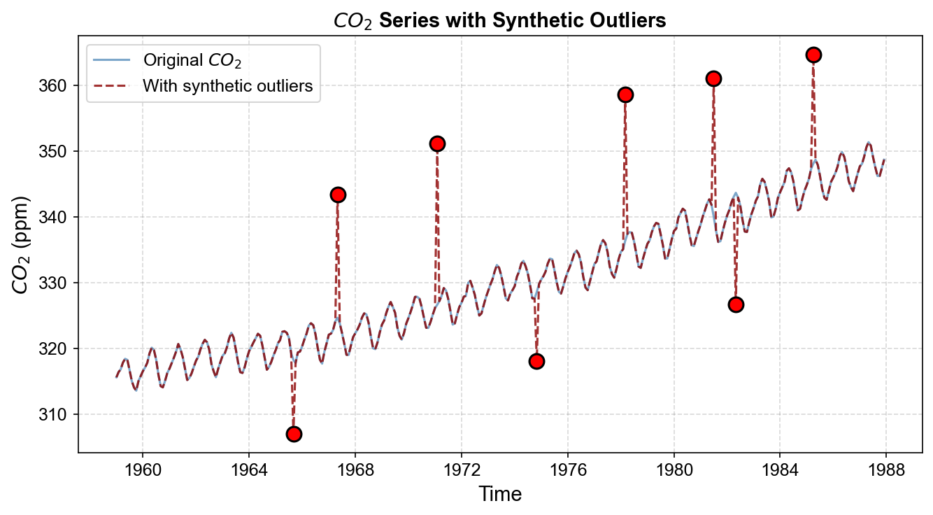 We’ve taken the clean CO₂ series and introduced 8 synthetic outliers at specific time points. Five are large positive spikes (adding 15-25 ppm to simulate sudden measurement jumps), and three are large negative drops (subtracting 10-18 ppm to simulate instrument drift). These outliers appear at dates like May 1967, February 1971, and so on—scattered throughout the series to show different scenarios.