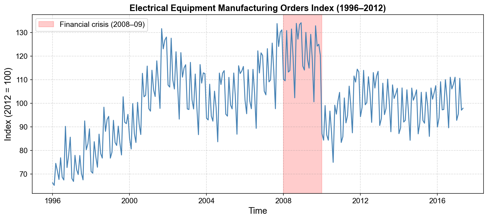 Fig. 3.21 Monthly electrical equipment orders index (1996–2012). The series exhibits a clear upward trend and strong seasonality up to 2007, followed by a sharp collapse during the 2008–2009 financial crisis (shaded region) and a partial recovery afterwards. This sudden, deep downturn provides a realistic stress test for STL decomposition methods.#