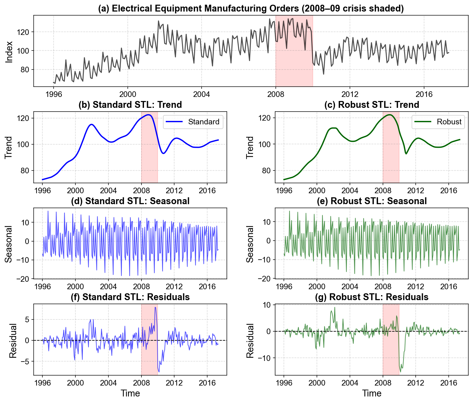 Fig. 3.22 Comparison of standard (left column) versus robust (right column) STL on electrical equipment orders. (a) Original series with the 2008–2009 crisis shaded. (b–c) Trend: Standard STL (blue) closely follows the crisis collapse, dragging the trend down toward the temporary low and then back up, which can overemphasize a short-lived event. Robust STL (green) yields a smoother trend that acknowledges the downturn but treats it more as a transient shock superimposed on the longer-term trajectory. (d–e) Seasonal: Around the crisis years, standard STL’s seasonal component becomes irregular and its amplitude varies noticeably, indicating contamination by the extreme observations. The robust seasonal component remains much more stable, preserving a consistent annual pattern across the full sample. (f–g) Residuals: Standard STL shows elevated residuals not only during the crisis but also in neighboring years, suggesting that the shock has “bled” into the fitted components. Robust STL concentrates large residuals mainly within 2008–2009, cleanly isolating the crisis impact in the residual term.#