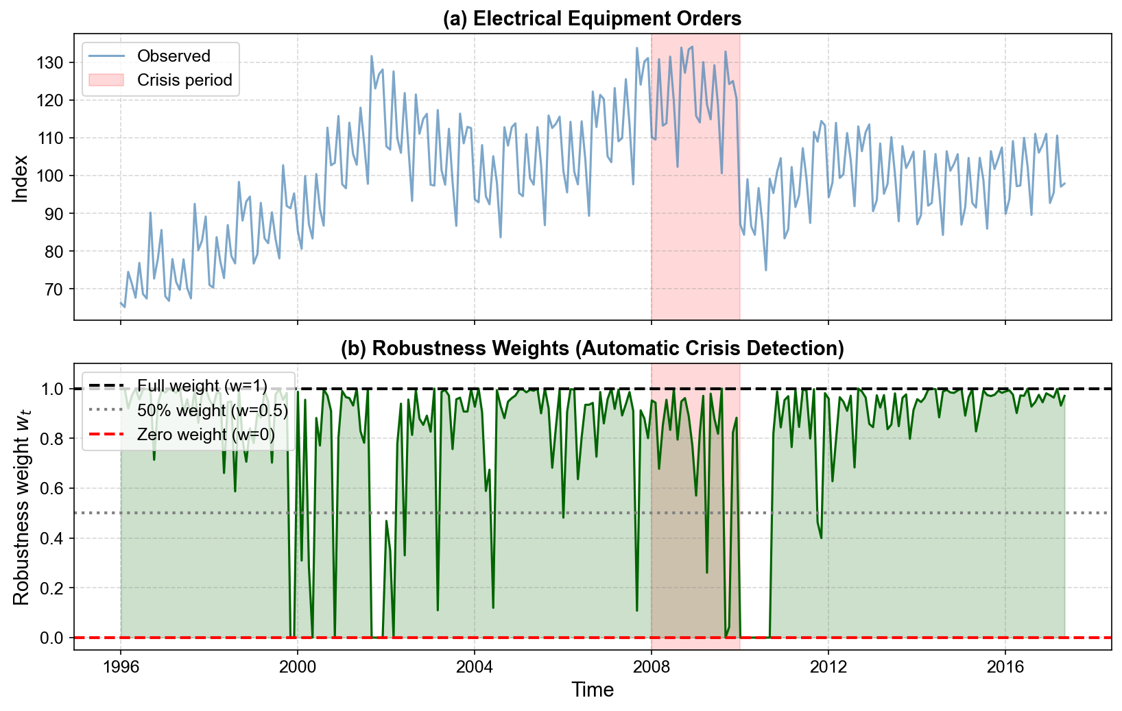The printed list of months with \(w_t < 0.5\) confirms this behavior. Out of 257 months, only 32 receive more than 50% downweighting. Many of these are clustered in 2009–2010, precisely when orders swing most violently, while a smaller number correspond to earlier isolated spikes and dips. This automatic identification of problematic periods is an important practical advantage: there is no need to hand-label crisis months before running the decomposition.