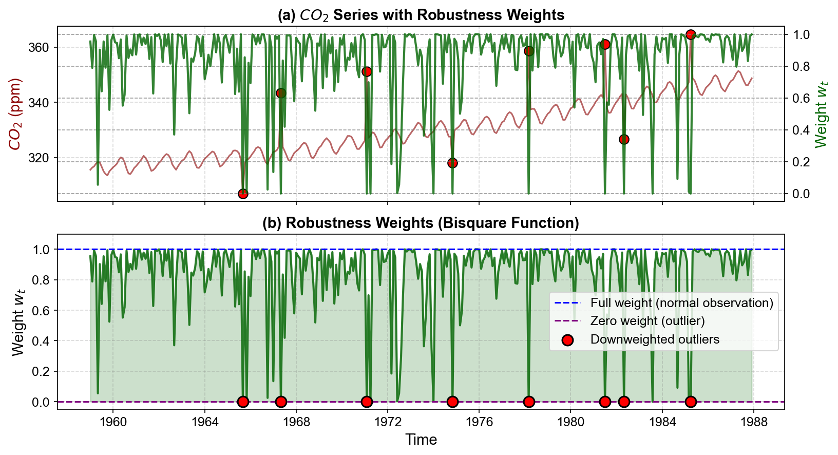 Extreme Outliers (\(u_t > 1.0\)): Any observation that is considered an extreme outlier (where \(u_t\) exceeds 1.0) is also assigned a zero weight (\(w_t = 0\)). This means these points are completely excluded from the estimation, preventing them from contaminating the decomposition.