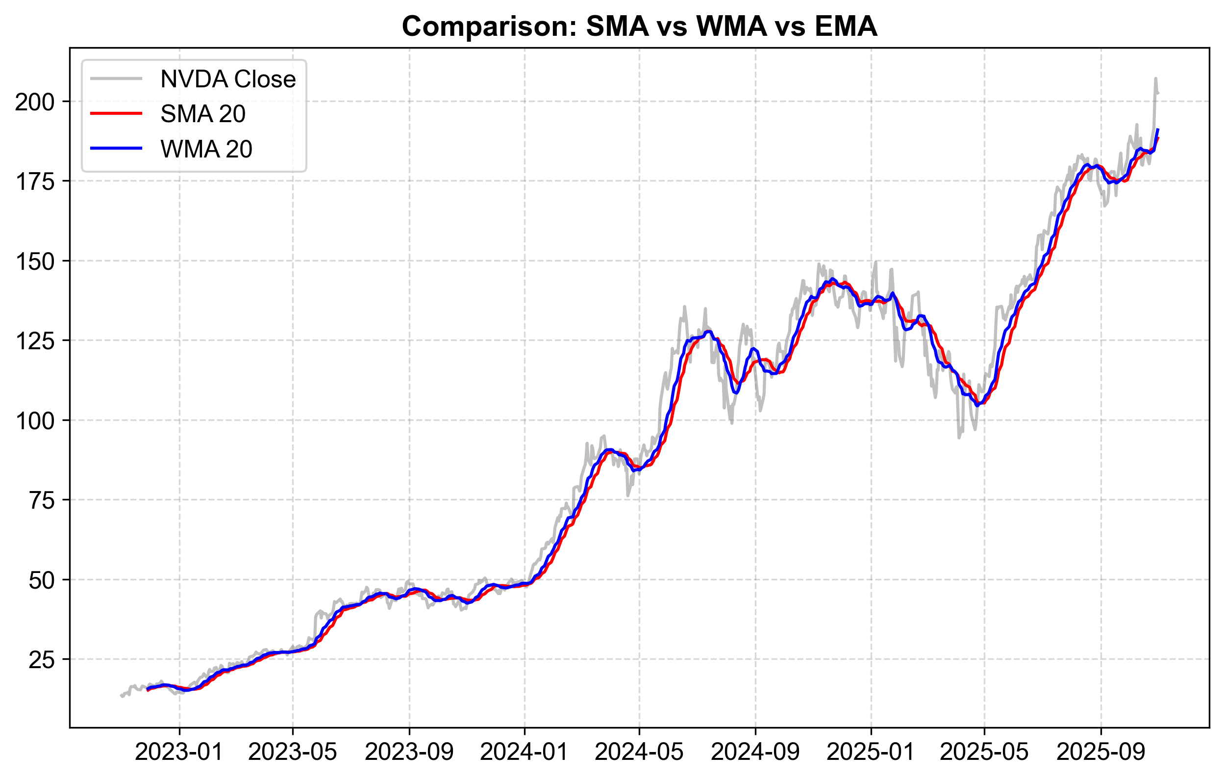 Final Surge (Late 2025): In the chart’s final months, as NVIDIA surges from $140 to above $185, both averages again converge closely. The powerful, sustained uptrend creates conditions where both methods produce similar results—when directional movement dominates over noise, the choice of weighting scheme matters less.