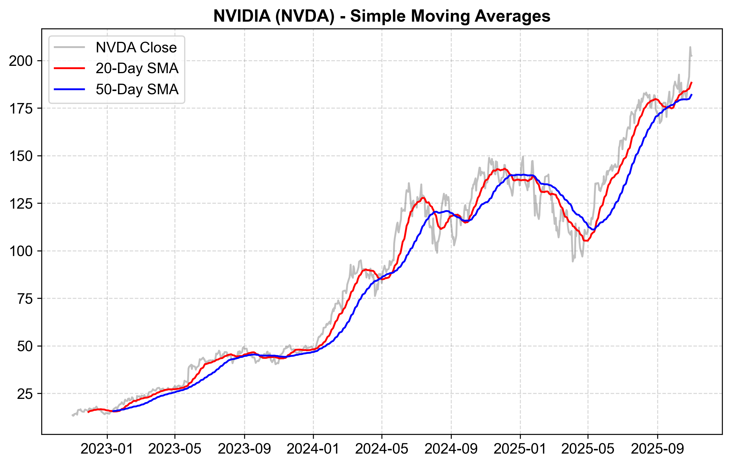 Fig. 4.1 NVIDIA (NVDA) closing prices with 20-day and 50-day simple moving averages from late 2022 through October 2025. The gray line represents actual closing prices, the red line shows the 20-day SMA, and the blue line displays the 50-day SMA.#