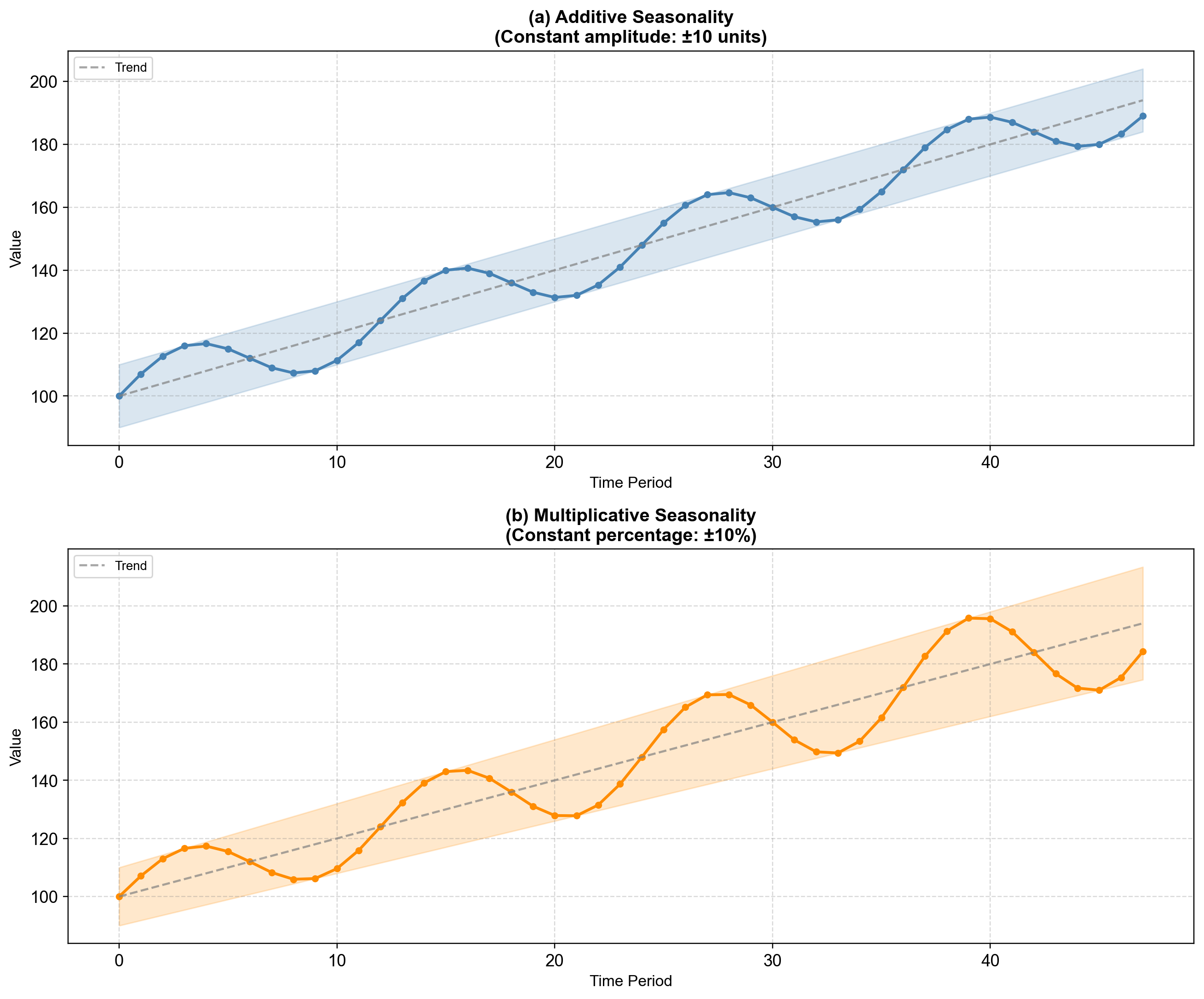 Fig. 4.6 The diagnostic test: Panel (a) Additive—the seasonal band (shaded blue) maintains constant width (±10 units) regardless of trend level. Panel (b) Multiplicative—the seasonal band (shaded orange) expands proportionally as the trend grows (±10% means 10 units at level 100, but 20 units at level 200).#