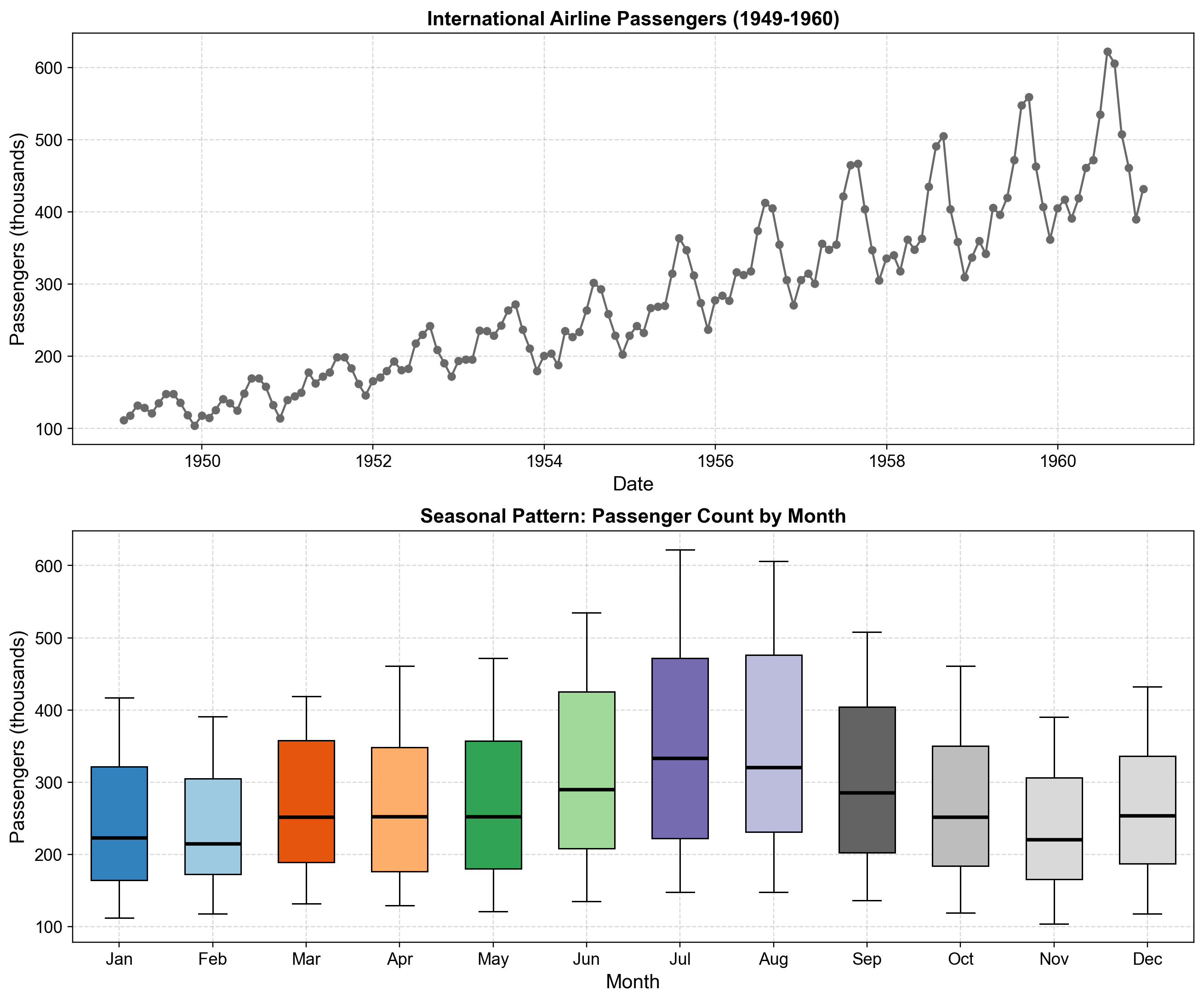 Fig. 4.7 Exploration of trend and seasonality in the airline passenger dataset. The top panel displays the complete monthly time series (1949–1960), revealing a strong upward linear trend from approximately 100 thousand to over 600 thousand passengers, with annual cycles that visibly increase in amplitude over time—a hallmark of multiplicative seasonality. The bottom panel presents boxplots grouped by calendar month, confirming the seasonal structure: peak travel consistently occurs in July and August (summer months with medians around 475 thousand), while November and February exhibit the lowest passenger counts (medians around 215-250 thousand). The expanding range of the boxplots over the years (indicated by longer whiskers and higher maxima in later years) further confirms that seasonal variations grow proportionally with the trend level.#