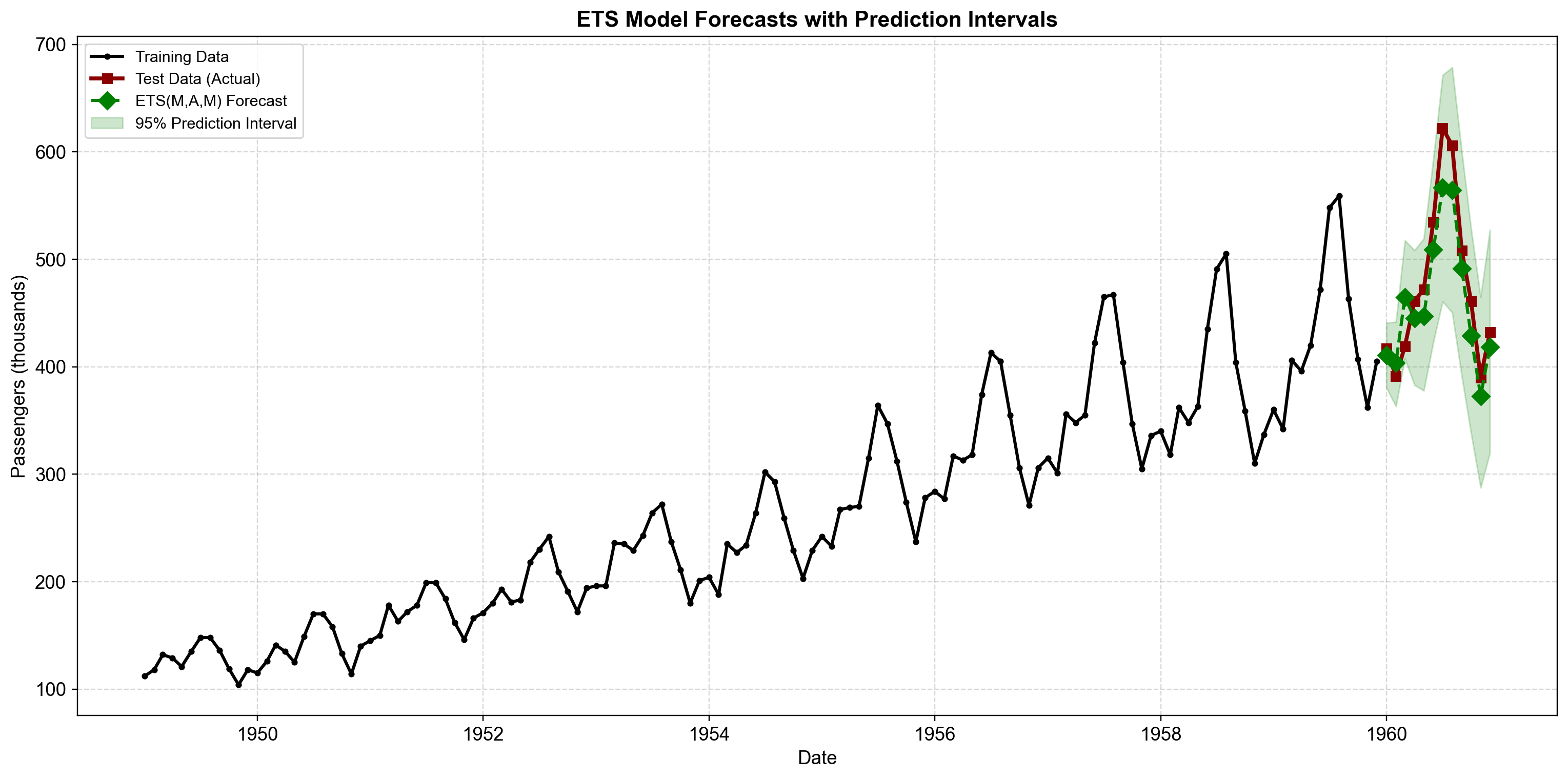 Fig. 4.10 ETS(M,A,M) forecasts with 95% prediction intervals. Training data (black circles, 1949–1959) and test data (dark red squares, 1960) are shown with point forecasts (green diamonds) and shaded 95% prediction bands. The intervals widen as the forecast horizon extends, reflecting increasing uncertainty—a critical feature for risk management unavailable in classical Holt-Winters. Notice how the interval width also scales with the forecast level (narrower in winter, wider in summer), appropriately reflecting multiplicative error structure where uncertainty grows proportionally with the series magnitude.#
