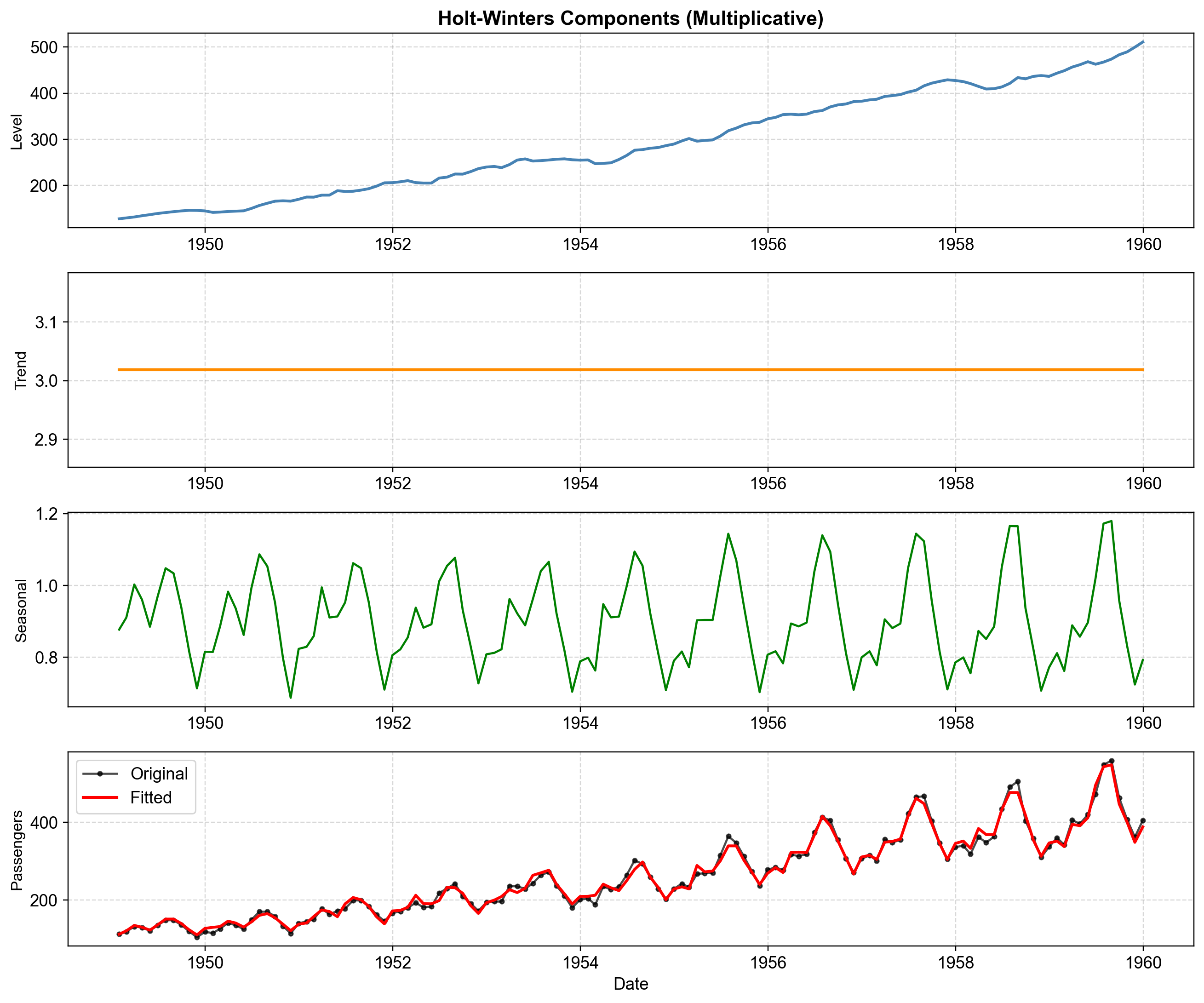 Fig. 4.9 Component decomposition of the multiplicative Holt-Winters model (fit_mul) fitted to airline passenger training data (1949–1959). Panel 1 (Level, fit_mul.level): The deseasonalized baseline grows smoothly from ~140k to ~500k passengers, representing underlying capacity growth without seasonal fluctuations. Panel 2 (Trend, fit_mul.trend): The monthly growth rate remains nearly constant at ~3.0 thousand passengers per month, confirming appropriateness of the linear (additive) trend specification. Panel 3 (Seasonal Factor, fit_mul.season): Multiplicative seasonal indices oscillate between 0.75 and 1.20; values above 1.0 indicate above-average months (summer peaks at 1.15–1.20×), while values below 1.0 indicate below-average months (winter troughs at 0.75–0.80×). Panel 4 (Reconstruction, fit_mul.fittedvalues): Multiplying \((L_t + T_t) \times S_t\) accurately reconstructs the original series (black) with the fitted values (red) tracking closely across all seasonal cycles.#