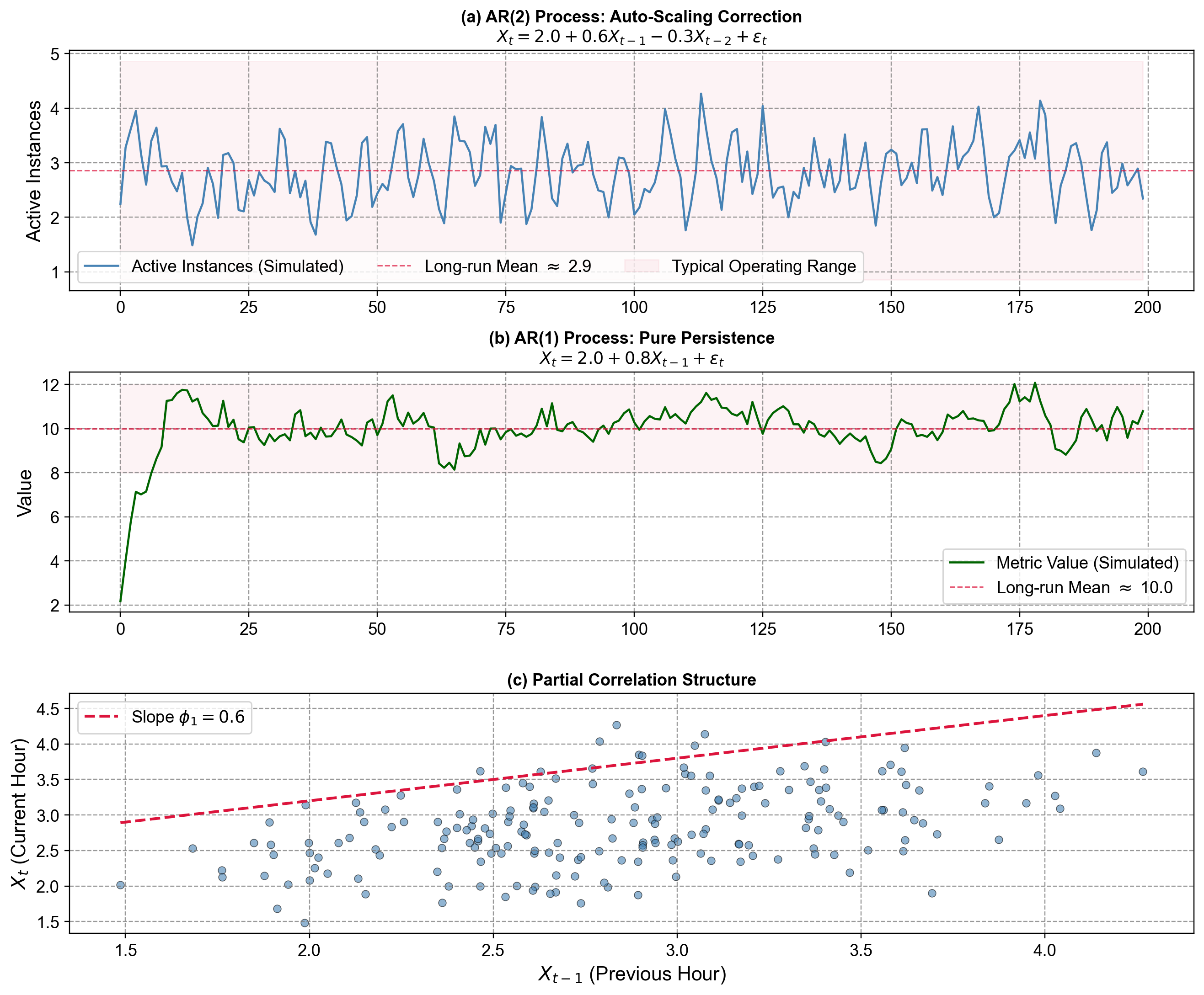 Fig. 4.12 Comparing AR Dynamics. (a) AR(2) Process: This series mimics our auto-scaling cluster. Notice the “wiggle”—when values spike, they tend to correct sharply downward shortly after. This is the effect of the negative \(\phi_2\) term (\(-0.3\)) acting as a dampener to prevent runaway growth. (b) AR(1) Process: By contrast, this series shows “pure momentum.” When it drifts above the mean, it tends to float there for longer periods. With only a positive \(\phi_1\) (\(0.8\)), there is no secondary correction force, resulting in smoother, wavier paths. (c) Lag Relationship: The scatter plot confirms the autoregressive nature: today’s value is strongly correlated with yesterday’s. The points cluster around the red line, but the spread is wider than a simple line because \(X_t\) also depends on the “hidden” variable \(X_{t-2}\).#