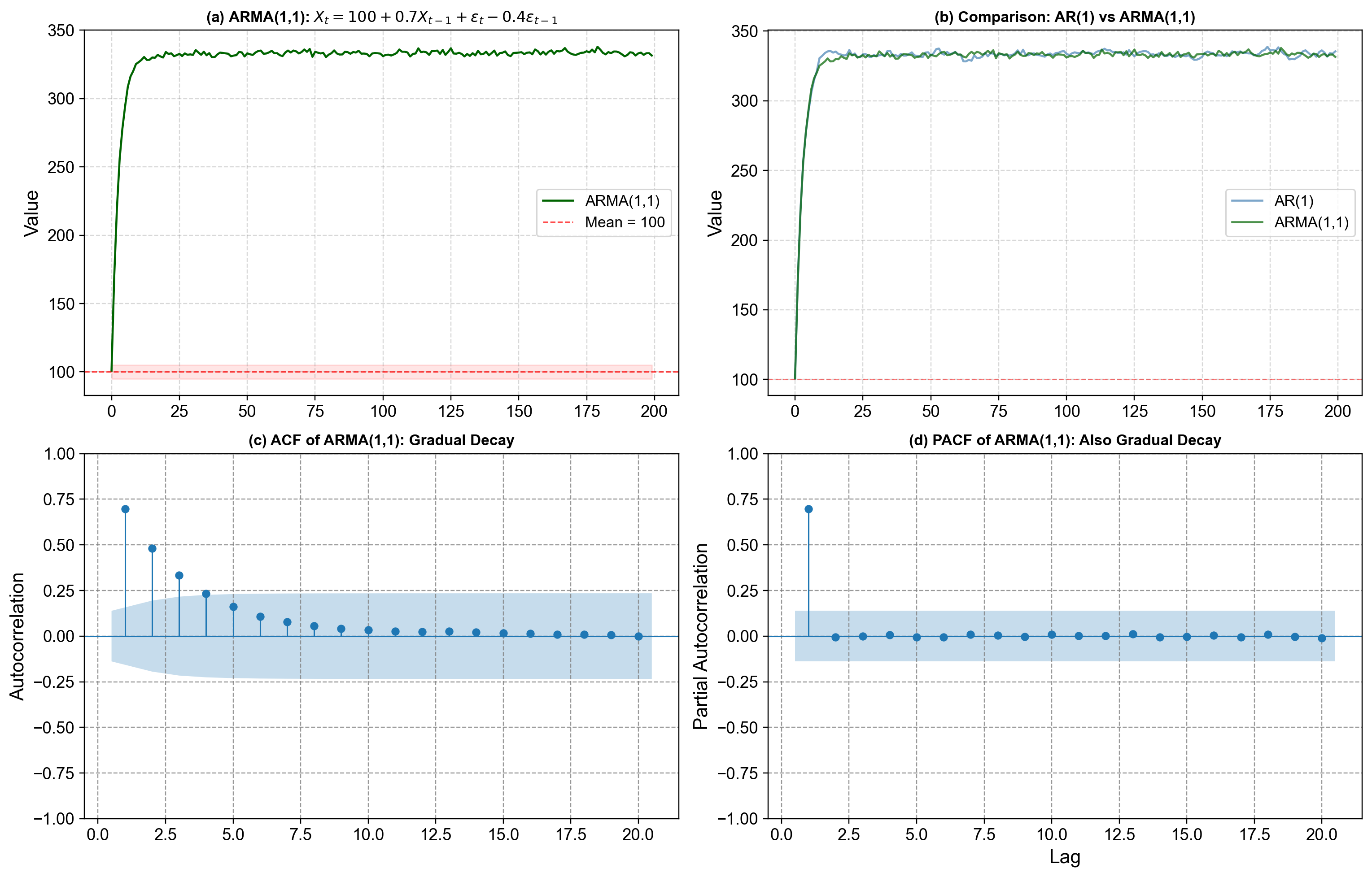Fig. 4.14 ARMA(1,1) process visualization. Top-left: One simulated ARMA(1,1) series from the model \(X_t = 100 + 0.7 X_{t-1} + \varepsilon_t - 0.4 \varepsilon_{t-1}\), plotted with a red dashed line at the long‑run mean 100 and a light band from \(c-5\) to \(c+5\), showing that the process stays in a stable range while exhibiting both persistence (values “remember” where they came from) and mean reversion (shocks do not permanently shift the level). Top-right: A side‑by‑side comparison of a pure AR(1) series with \(X_t = 100 + 0.7 X_{t-1} + \varepsilon_t\) and the ARMA(1,1) series, where both share the same AR coefficient 0.7, but the ARMA path is visibly more stable and less volatile because the MA part \(-0.4 \varepsilon_{t-1}\) counteracts part of each shock and dampens swings. Bottom-left: The sample autocorrelation function (ACF) of the ARMA(1,1) series, which decays gradually rather than cutting off sharply at a specific lag, reflecting the combined influence of AR and MA terms. Bottom-right: The partial autocorrelation function (PACF), which also decays gradually instead of stopping abruptly, reinforcing the idea that neither a pure AR nor a pure MA pattern is present—both components are active in shaping the dependence structure.#