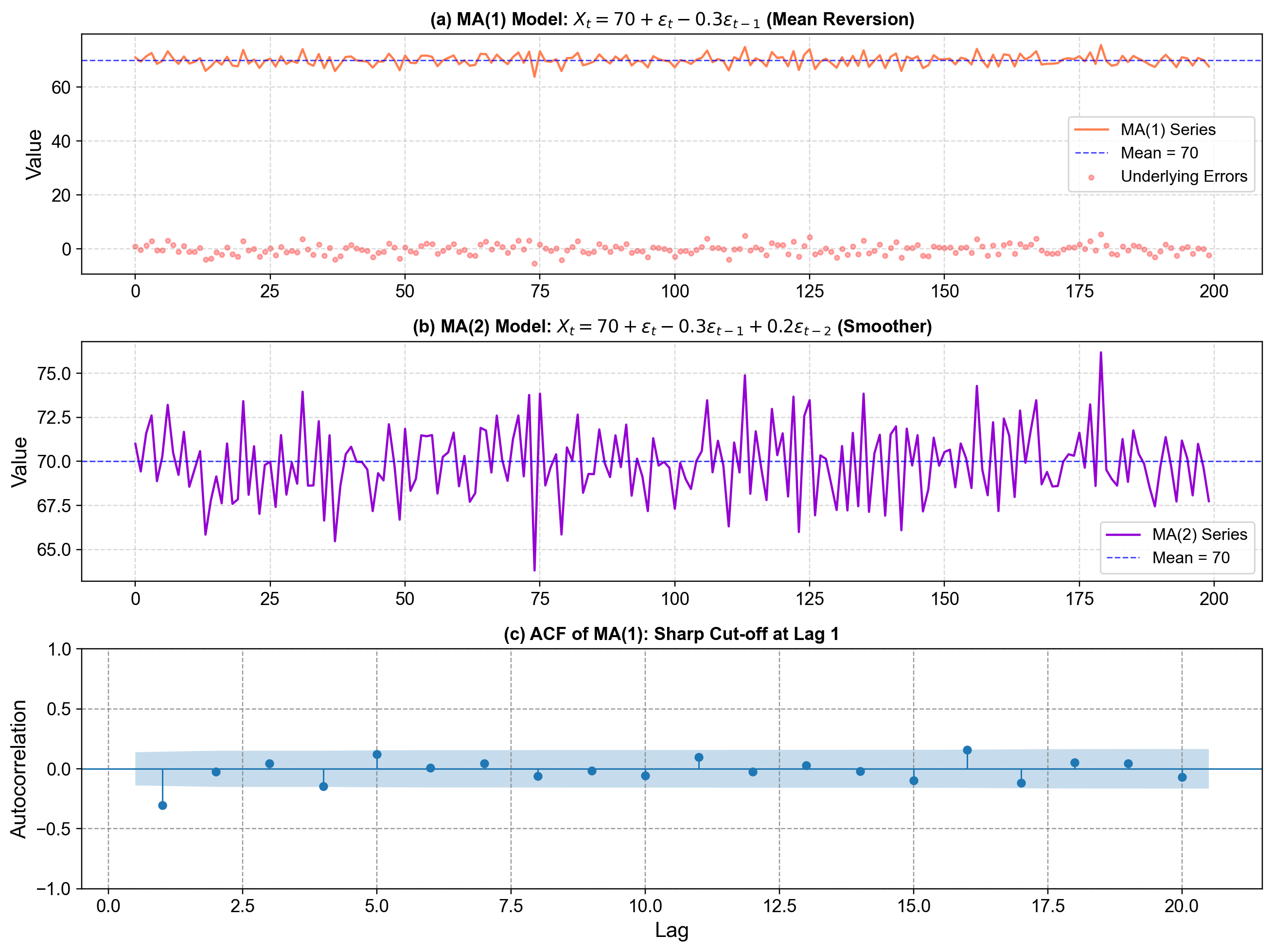 Fig. 4.13 MA(1) and MA(2) process visualization. (a): One simulated MA(1) time series from the model \(X_t = 70 + \varepsilon_t - 0.3 \varepsilon_{t-1}\), plotted together with the horizontal blue dashed line at the long‑run mean 70 and the underlying white‑noise errors as red points; this panel shows how each random shock \(\varepsilon_t\) hits the series but is partially undone by the \(-0.3 \varepsilon_{t-1}\) term on the next step, producing quick mean reversion back toward 70. (b): A simulated MA(2) series from \(X_t = 70 + \varepsilon_t - 0.3 \varepsilon_{t-1} + 0.2 \varepsilon_{t-2}\), again around mean 70, which looks smoother because each value averages over two past errors—the extra \(\varepsilon_{t-2}\) term spreads the effect of shocks out over more periods and reduces the variability seen in the summary statistics printed below the plot. (c): The sample autocorrelation function (ACF) of the MA(1) series, showing a strong spike at lag 1 and then values near zero for higher lags, illustrating the theoretical property that an MA(1) process has non‑zero autocorrelation only at lag 1, with a sharp cut‑off after that.#