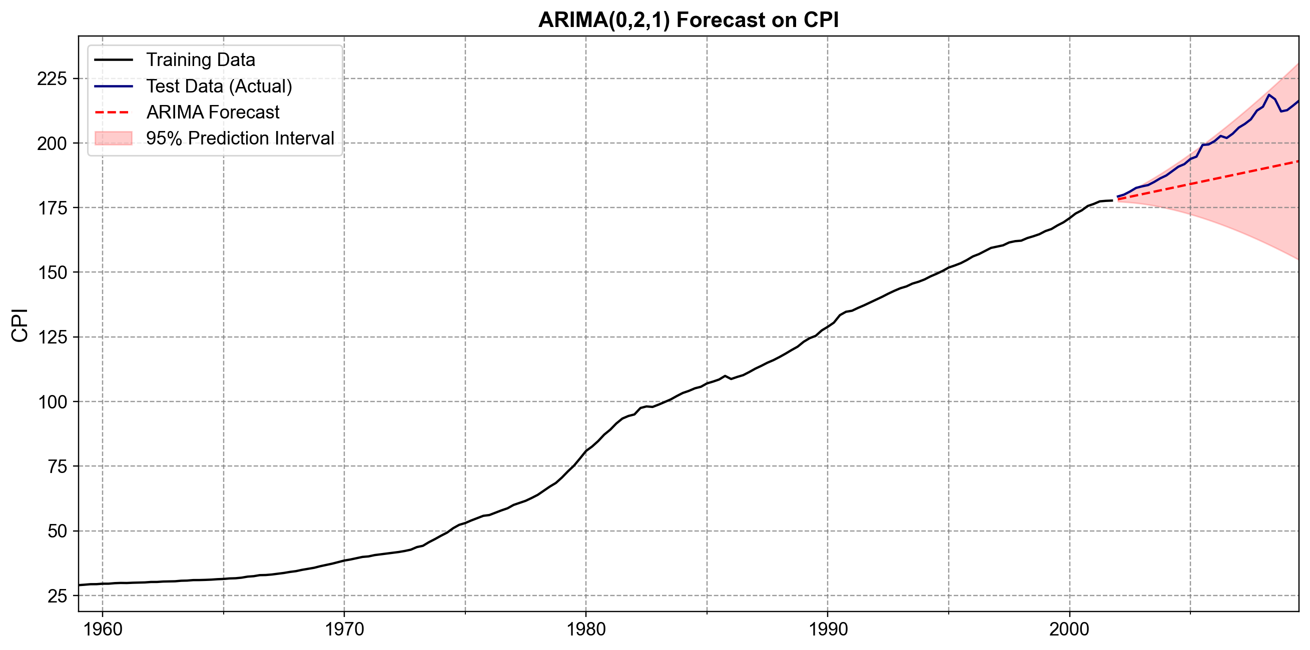 Fig. 4.22 Forecasting with ARIMA(0,2,1). The black curve shows the training data, the navy curve shows the actual held-out observations, and the red dashed line is the forecast. Because the model uses \(d=2\) (second differencing), it projects a linear trend based on the most recent “velocity” (change in inflation) at the end of the training set. The 95% prediction interval (red shaded region) widens rapidly, correctly reflecting the high uncertainty of predicting non-stationary macroeconomic data over long horizons.#