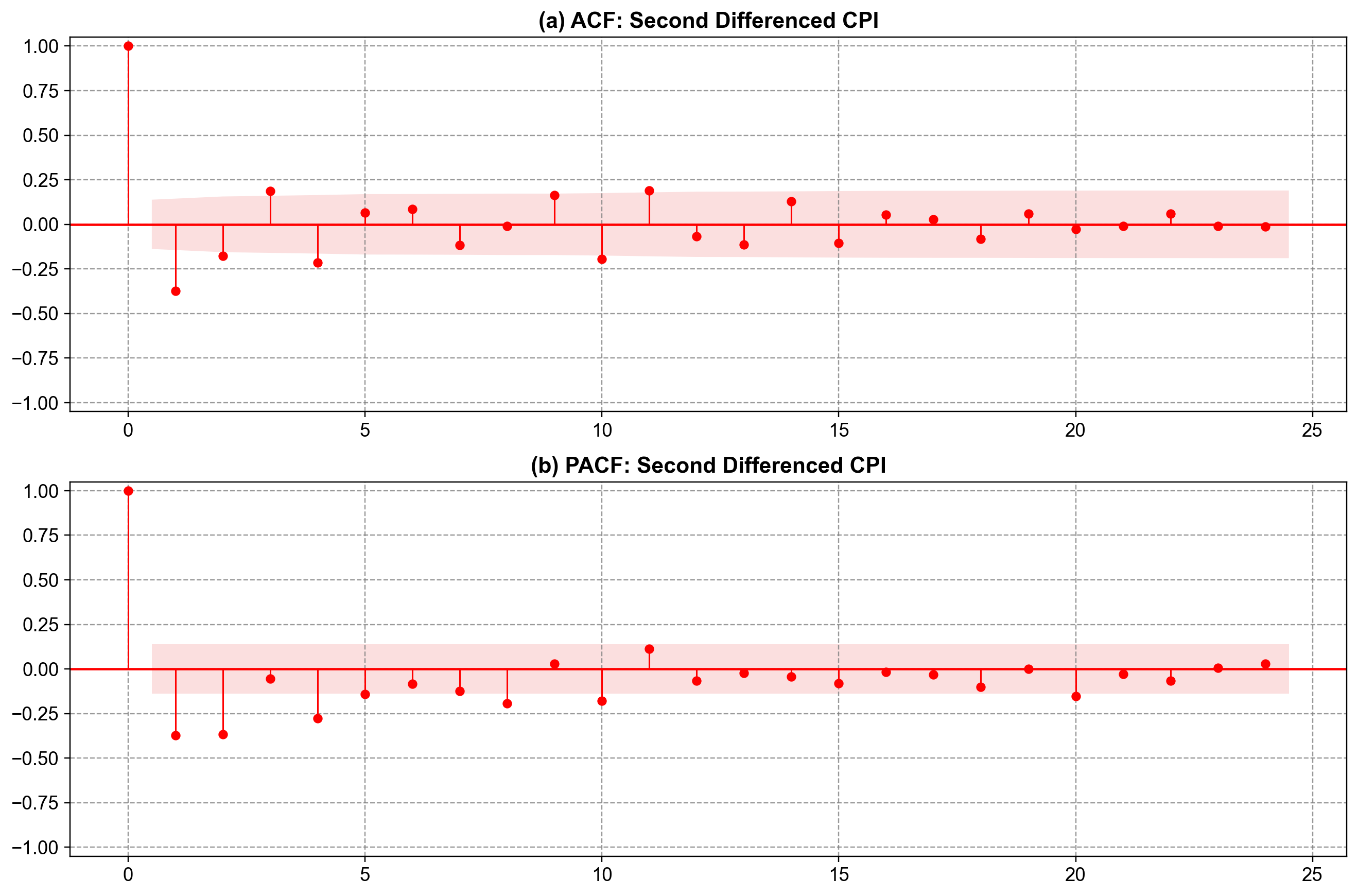 Fig. 4.21 Sample ACF and PACF of the second differenced CPI. Panel (a): The ACF shows a significant negative spike at Lag 1, followed by a sharp cutoff. This is the classic signature of an MA(1) process with a negative coefficient. Panel (b): The PACF shows a decaying or oscillating pattern (damped sine wave), which confirms the MA(1) diagnosis. Conclusion: The structure suggests an ARIMA(0,2,1) model.#