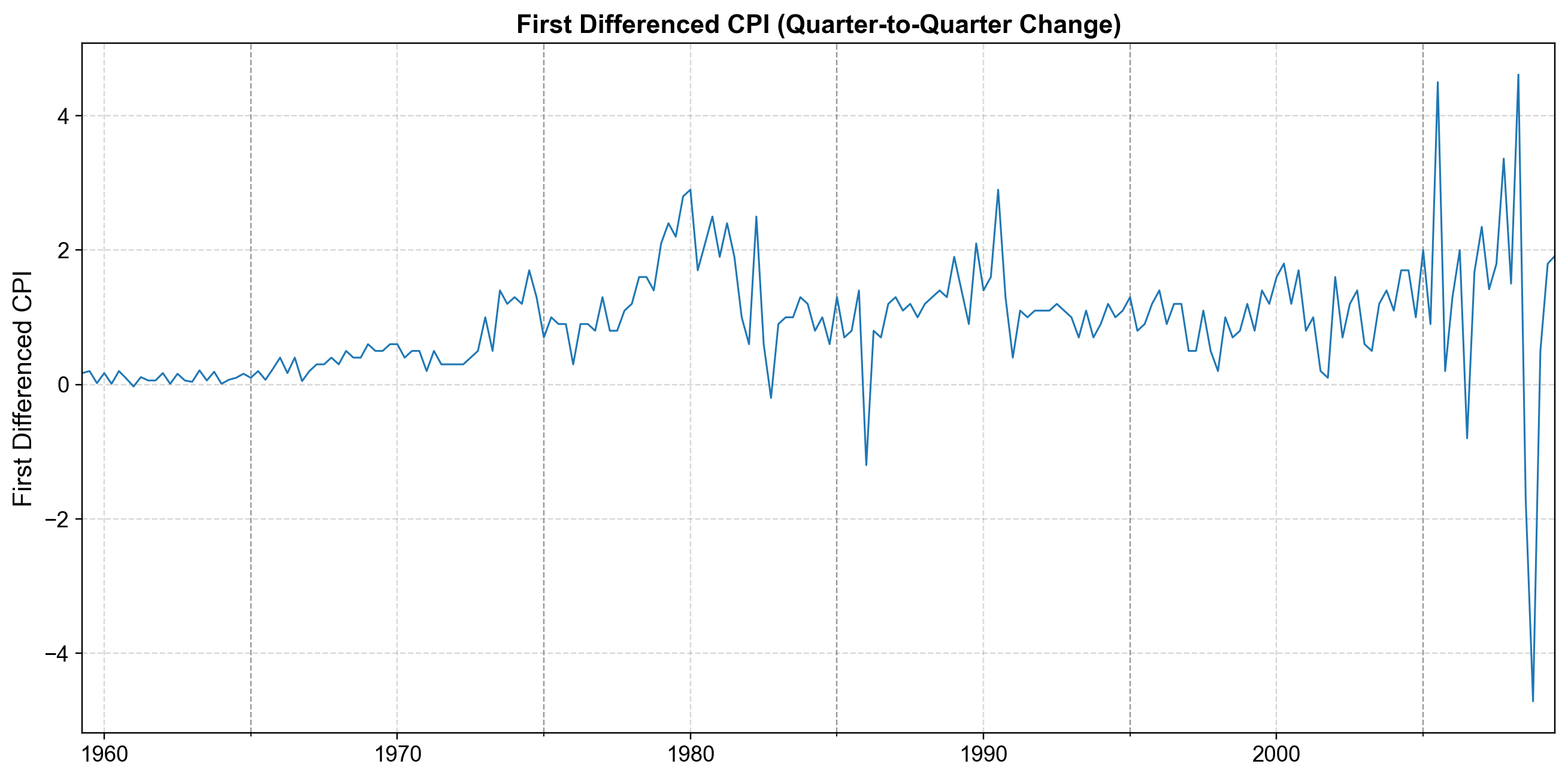 Fig. 4.19 First Difference (\(d=1\)). Quarter-to-quarter changes in CPI. While the strong upward trend is gone, the series still shows signs of wandering behavior, particularly in the later years, suggesting that a single difference may not be enough to achieve full stationarity.#