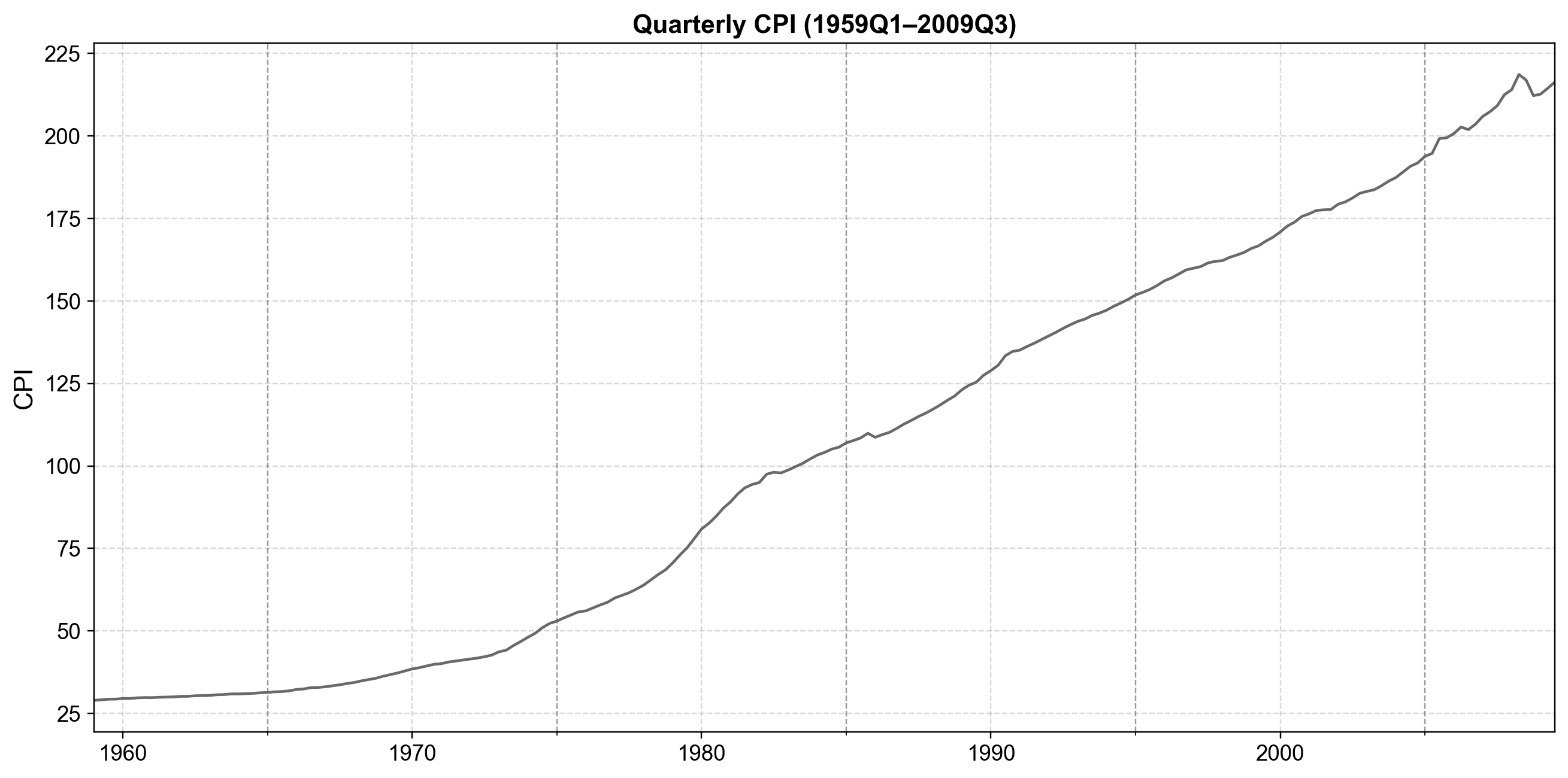 We now turn to a series that clearly violates the stationarity assumption: U.S. quarterly CPI from 1959Q1 to 2009Q3. This series exhibits a strong upward trend, so an ARMA(p,q) model on the raw levels would be inappropriate.