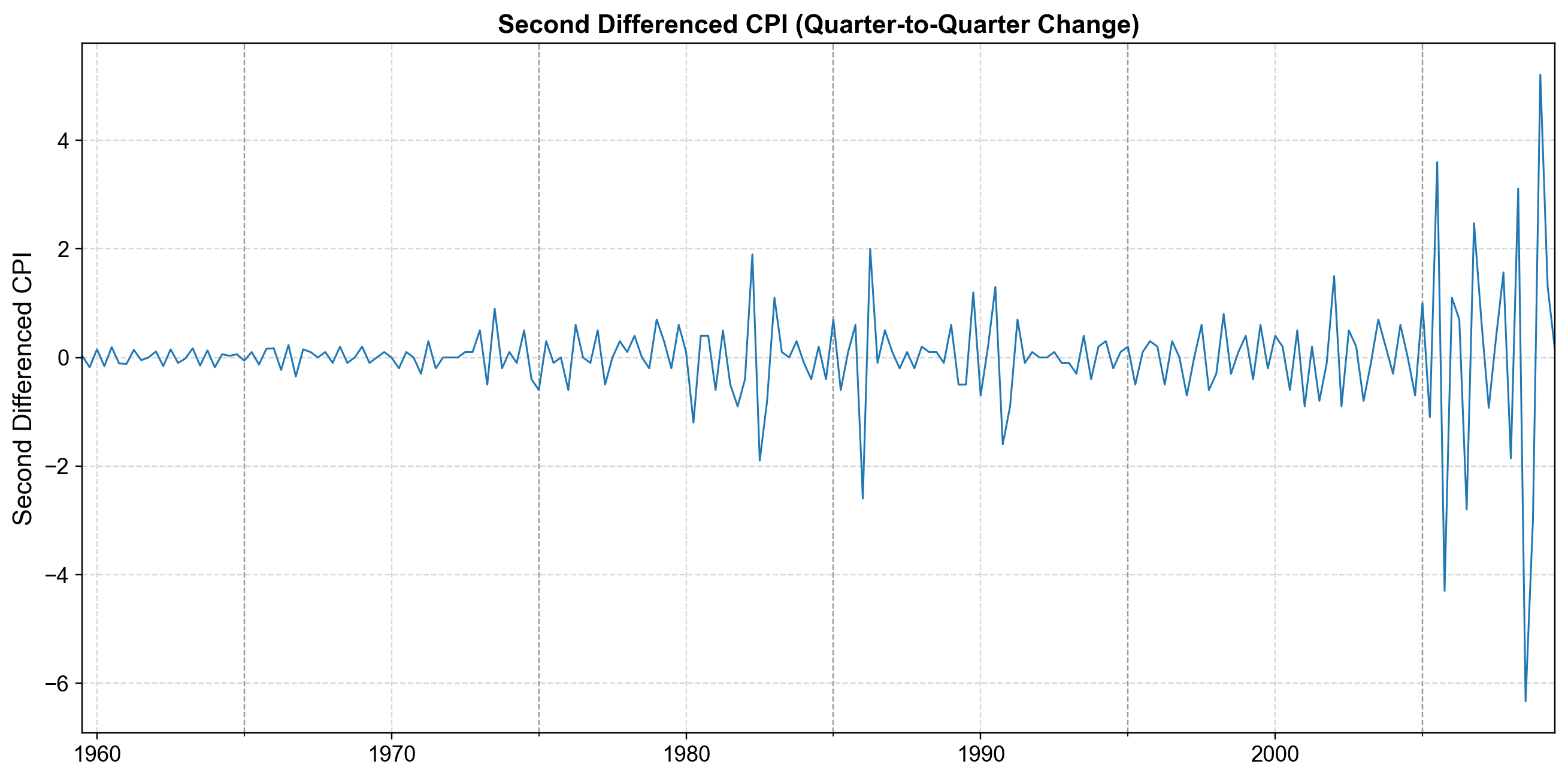 Fig. 4.20 Second Difference (\(d=2\)). The acceleration of prices (change in inflation). This series oscillates rapidly around a constant mean of zero with stable variance. The ADF test confirms this is fully stationary (\(p < 0.01\)), identifying \(d=2\) as the appropriate differencing order for our ARIMA model.#