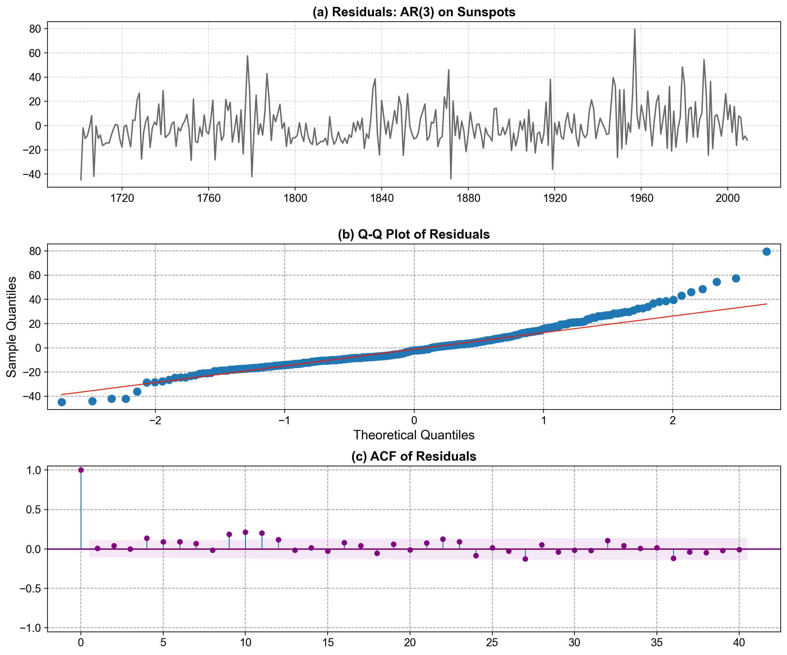 Fig. 4.17 Residual diagnostics for the AR(3) model fitted to annual sunspot counts. Panel (a) shows residuals fluctuating around zero without obvious long-term trends, suggesting that most large-scale structure in the series has been captured. Panel (b) presents a Q–Q plot comparing residual quantiles to a normal distribution; points follow the reference line closely in the center but deviate in the extreme tails, indicating only mild departures from normality. Panel (c) displays the ACF of the residuals, with most autocorrelations inside the confidence band, implying little remaining temporal dependence and supporting the adequacy of the AR(3) specification.#