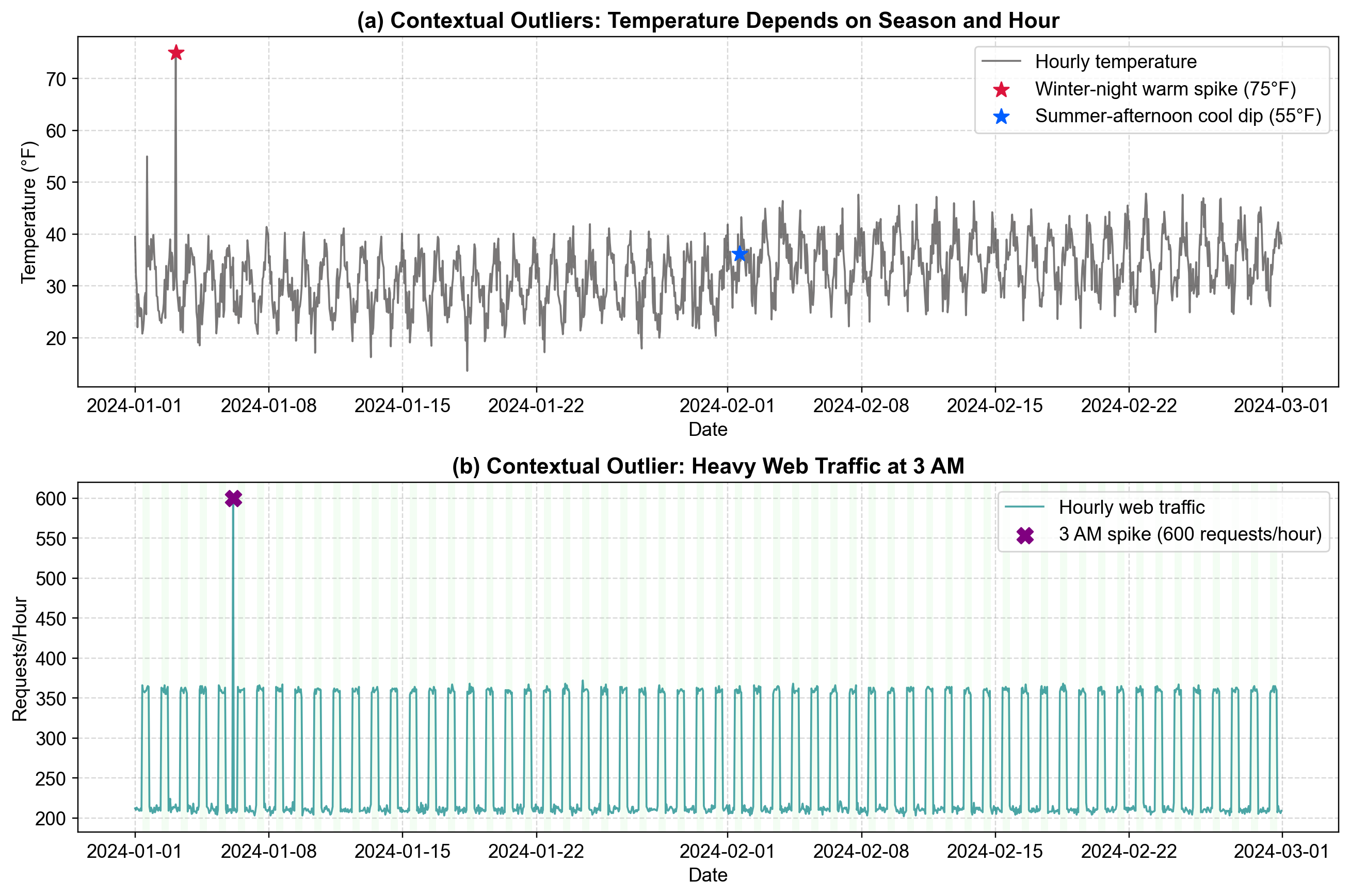 Fig. 5.6 Visualizing Contextual Outliers. Panel (a): The red star marks a 75°F reading in January. While 75°F is common in July (orange line), it is physically impossible for the winter trend (blue line). Panel (b): The purple ‘X’ marks a traffic spike of 600 requests at 3:00 AM on a Sunday. While 600 requests is standard during business hours (green shaded region), it is highly anomalous during the off-hours trough.#