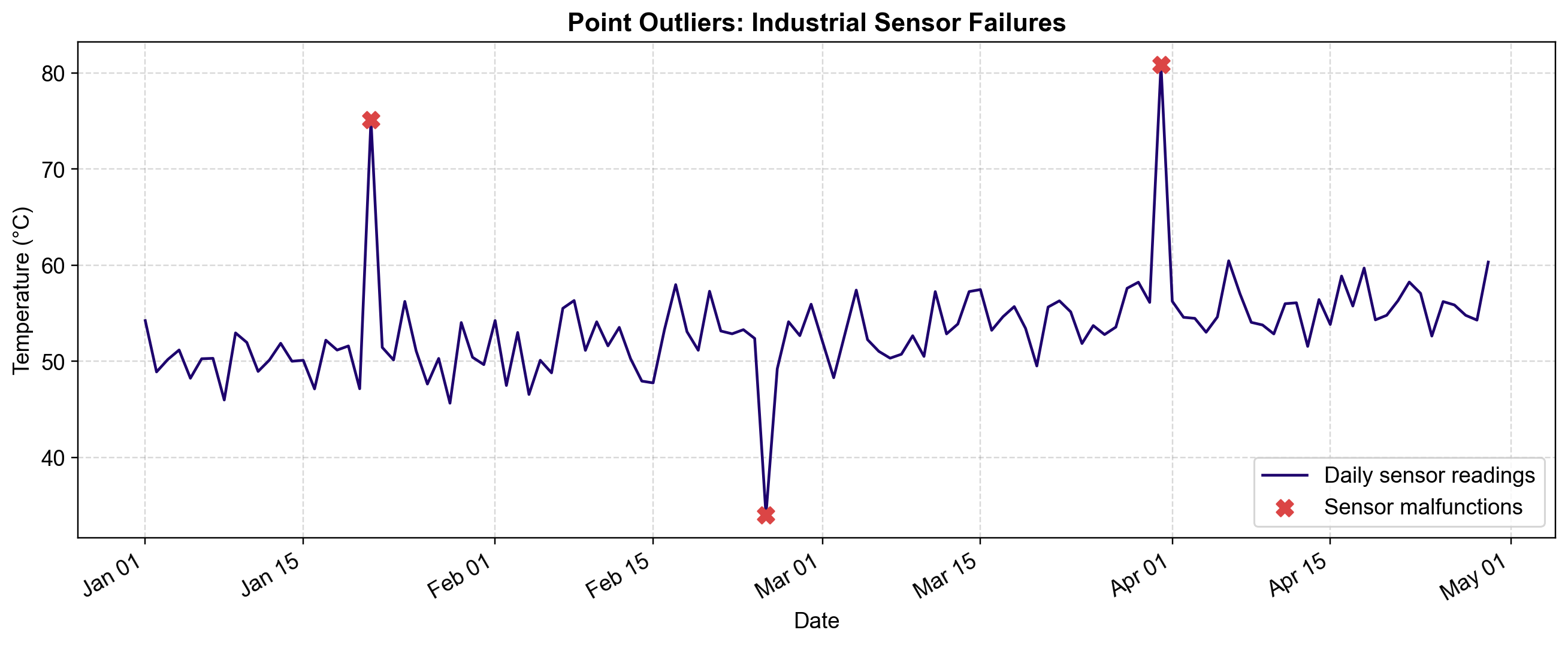 Fig. 5.5 Visualizing Point Outliers. The blue line shows the normal behavior of the sensor: a steady drift with consistent variance. The three red ‘X’ markers identify point outliers—isolated moments where the sensor reported values (e.g., +20°C spike, -18°C drop) that are statistically impossible given the global distribution of the data.#