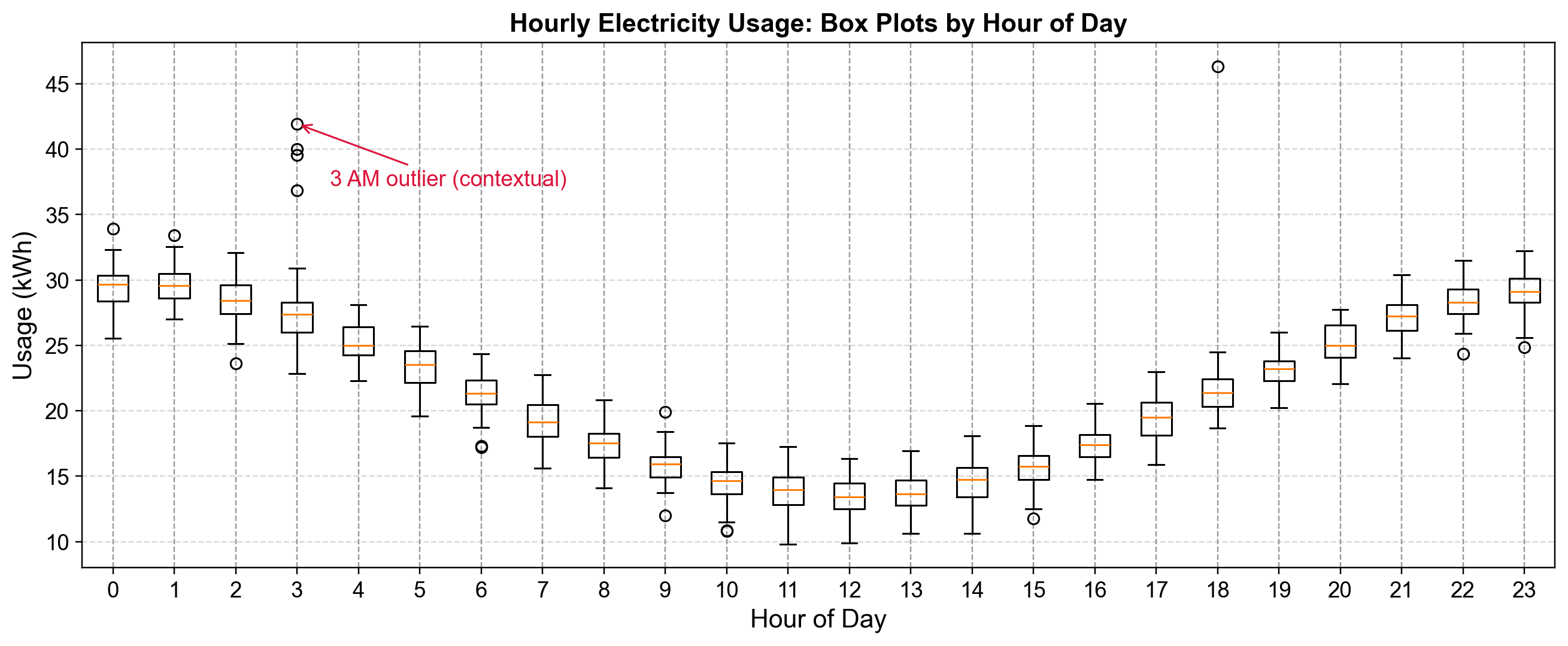 Fig. 5.16 Hourly electricity usage box plots showing the daily cycle. Individual dots beyond whiskers represent days with unusually high usage for that specific hour, with contextual outliers highlighted at 3 AM.#