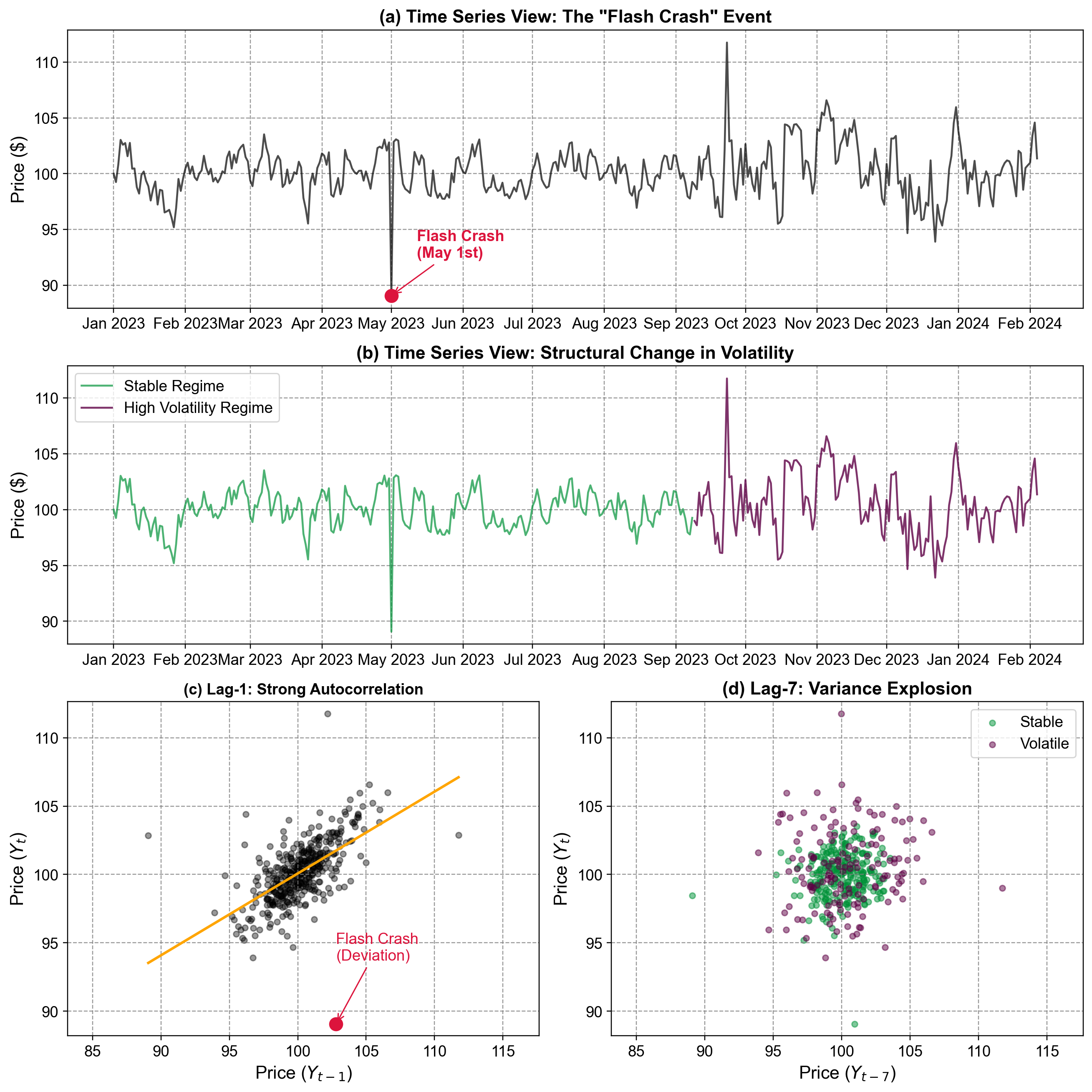 To illustrate the diagnostic power of lag plots, we generate a synthetic daily price series using an Autoregressive AR(1) process centered at $100 with a persistence parameter \(\phi=0.7\). This setup mimics typical stock price behavior where today’s price is strongly correlated with yesterday’s. We then inject two specific anomalies: a sudden “Flash Crash” on May 1st (simulating a discrete shock) and a structural increase in volatility starting in late 2023 (simulating a regime change). By comparing the time series view with lag plots, we can see how these distinct temporal features manifest differently across diagnostic tools.