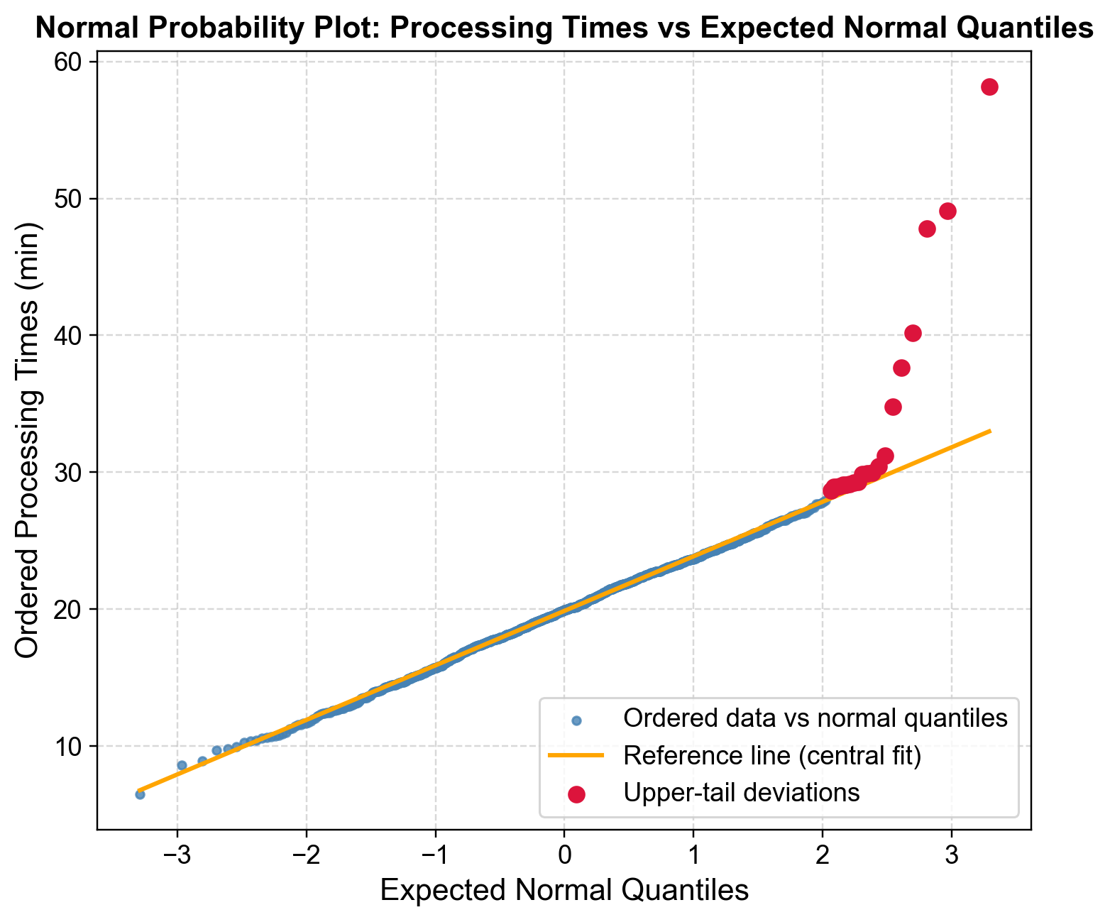 Fig. 5.21 Normal probability plot of manufacturing processing times. Central linearity confirms approximate normality for typical operations, but upper-tail curvature reveals heavy-tailed delays.#