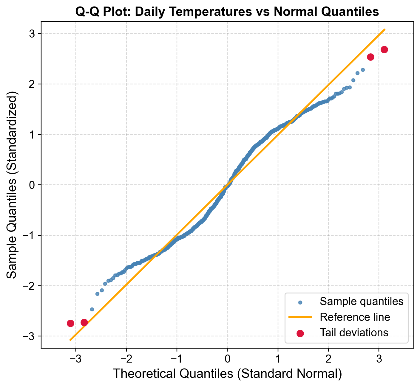 Upper Tail Deviations: Red points above the reference line (theoretical quantiles >+2) represent unusually hot days exceeding normal predictions, reflecting heat waves or climate variability. The symmetric tail deviations suggest leptokurtic (heavy-tailed) behavior with excess kurtosis rather than skewness [Chambers et al., 2018, Chandola et al., 2009].