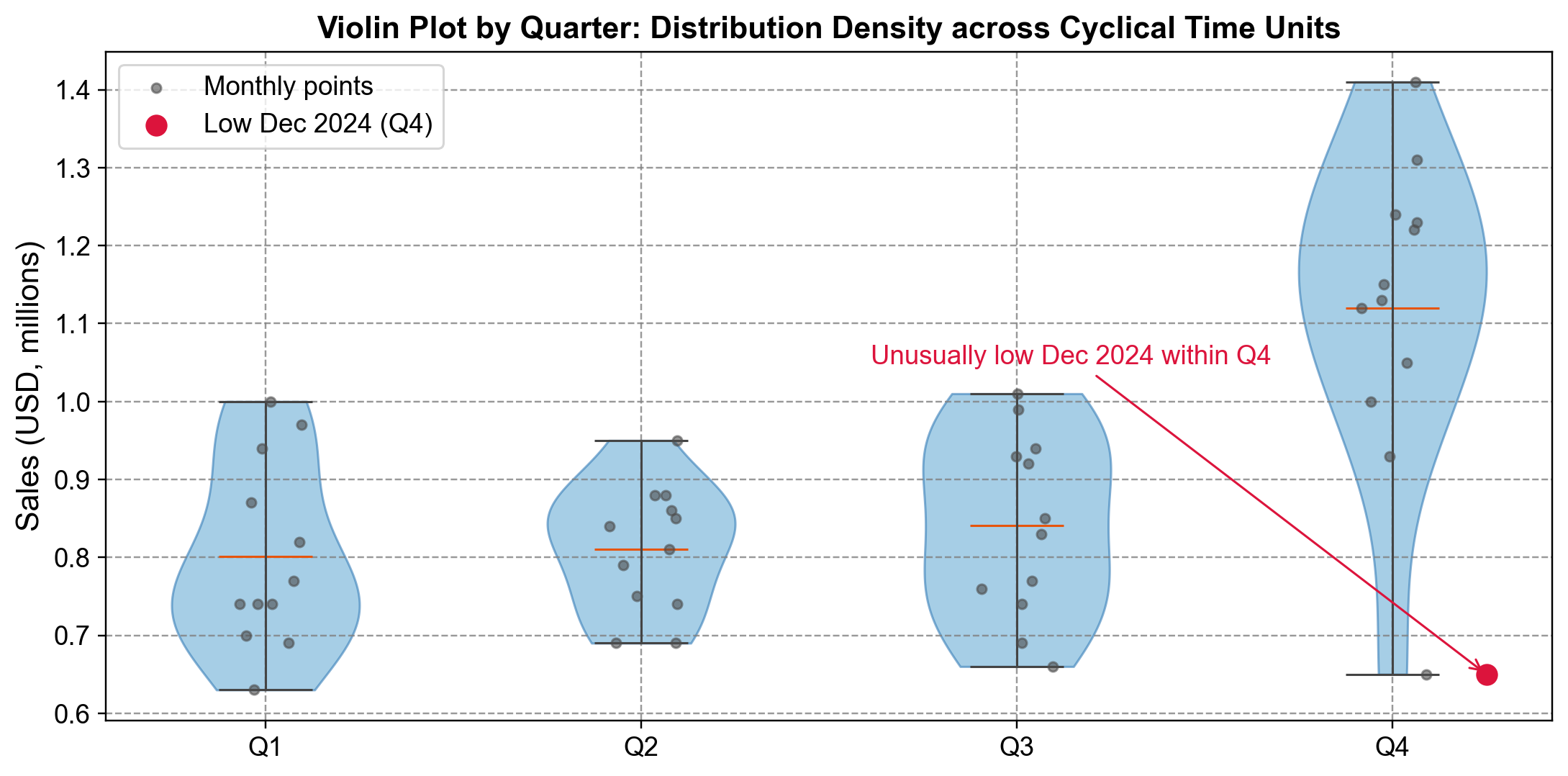 Outlier Identification: The red marker identifies December 2024 at $0.65M—positioned far below Q4’s dense region and even lower than typical Q1-Q3 values. While every other Q4 observation clusters in $1.0-$1.4M, this point sits in isolation, warranting investigation into data errors, supply chain disruptions, or market changes [Hintze and Nelson, 1998].