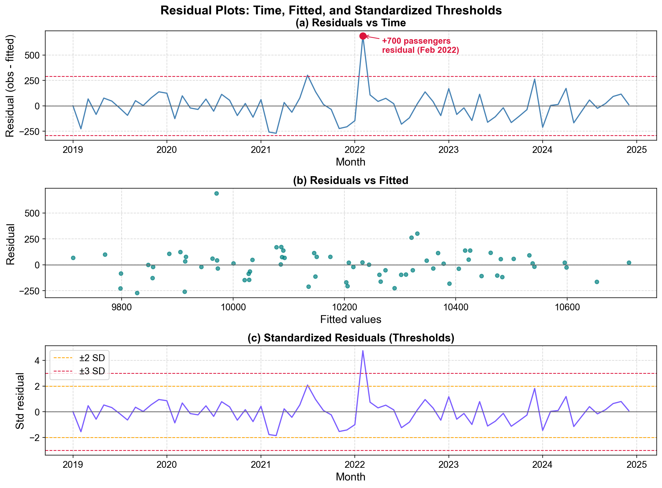 Residuals vs Time (Top): Raw residuals oscillate around zero within ±200 passengers, with red dashed lines marking ±2 SD thresholds at ±240. The February 2022 outlier (+700 passengers) exceeds this threshold by 3×, warranting investigation into promotional events, competitor disruptions, or data errors.