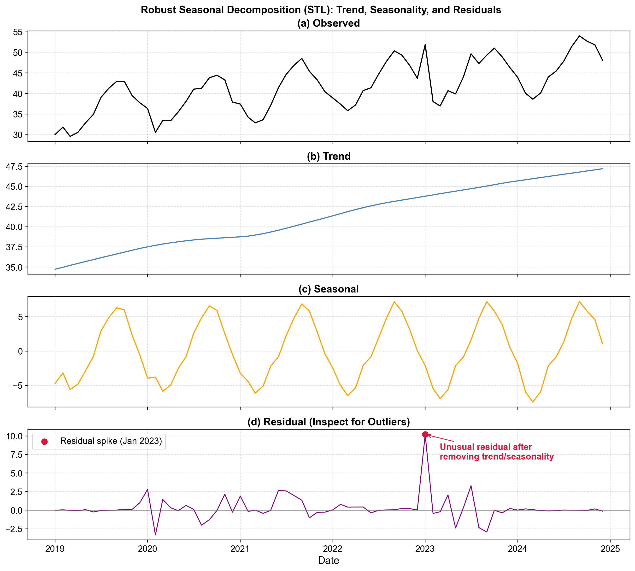 The critical insight: the January 2023 anomaly appears as routine fluctuation in raw data but stands out unmistakably in residuals. STL’s robustness to outliers ensures extreme values don’t distort fitted components, making anomalies prominent in residuals [Cleveland et al., 1990]. For multiple seasonal periods (e.g., daily data with weekly and annual cycles), advanced methods like MSTL handle complex structures.