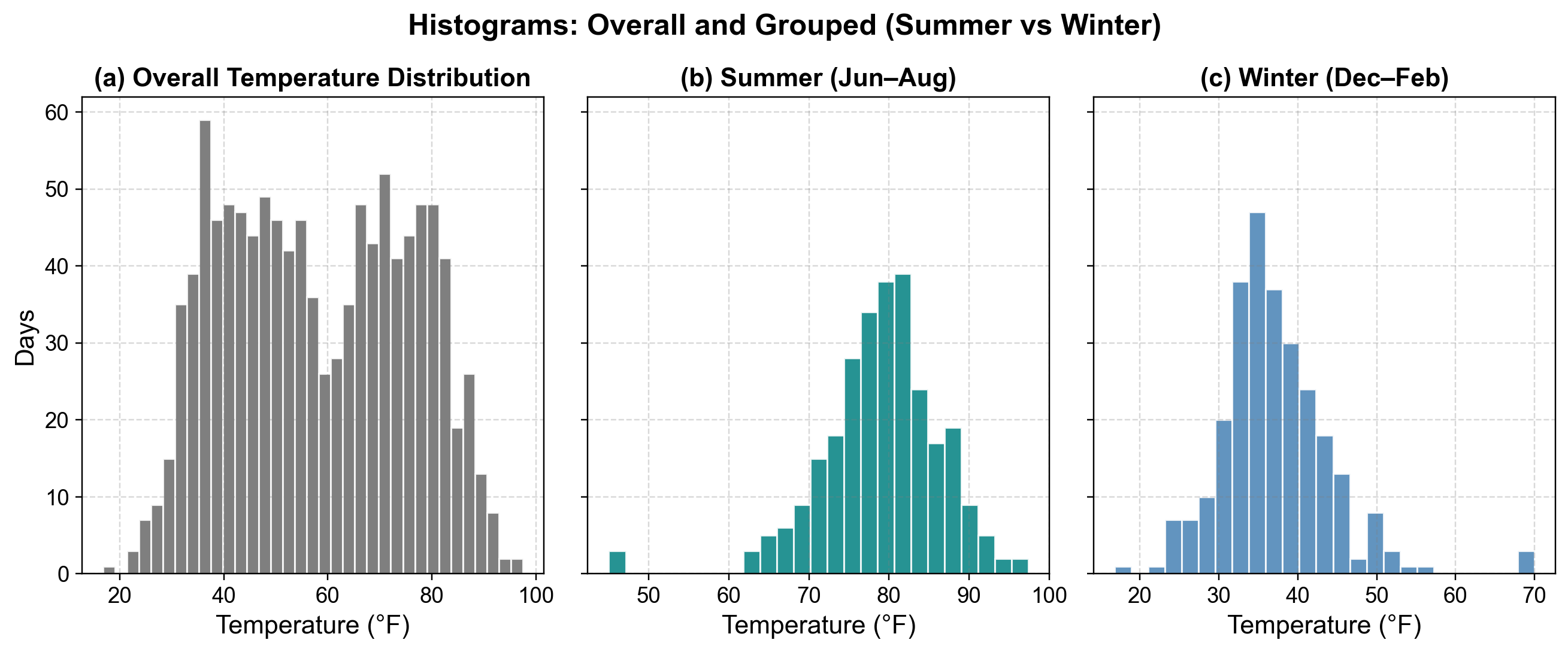 Winter Distribution (Right Panel): The teal histogram shows the distribution for winter months (December-February), revealing a concentration around 35-42°F with most observations ranging from 25-55°F. This distribution is also approximately normal but centered at a much lower temperature than summer. The key insight appears on the far right: a single isolated bar around 70°F stands apart from the main cluster. This observation—which blended seamlessly into the overall annual histogram—is clearly anomalous when viewed in its winter context. A 70°F day in January represents either a genuine extreme weather event or a data quality issue requiring investigation.