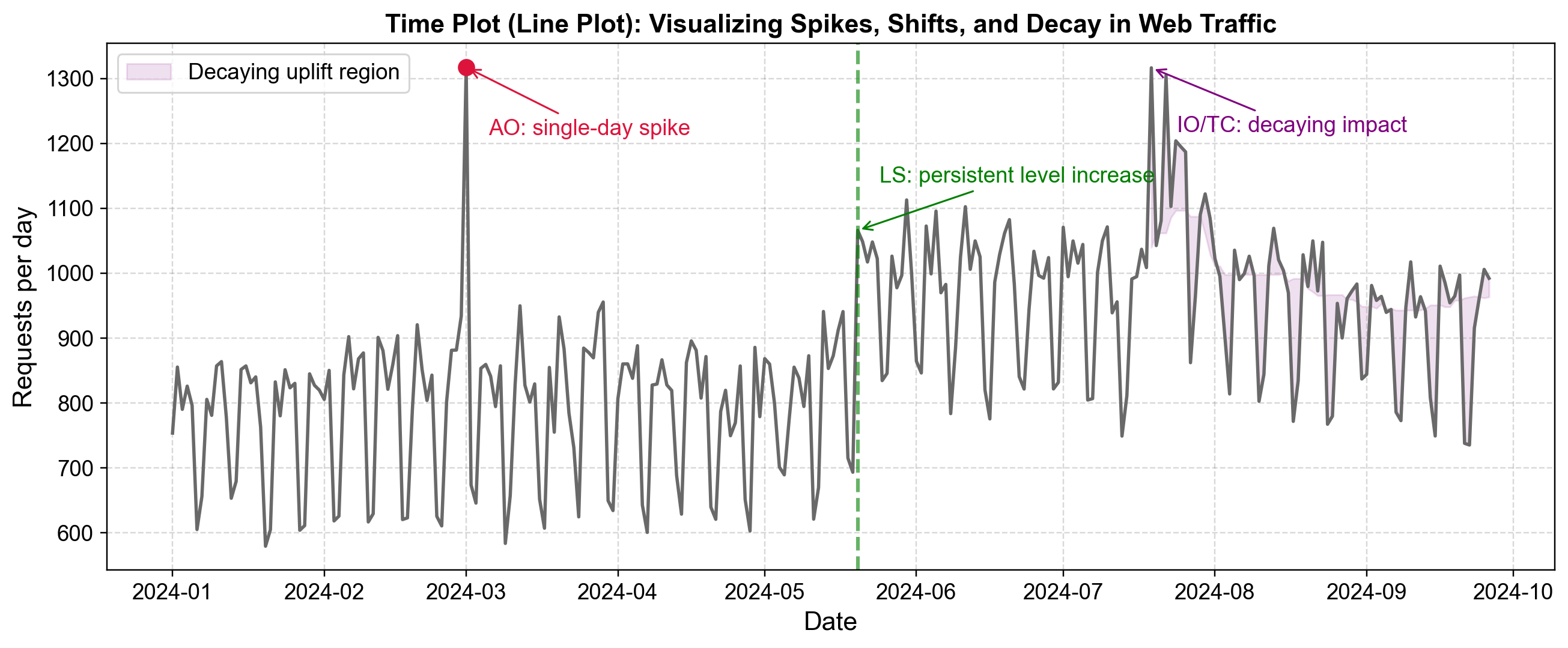 Decaying Impact (Late July/Early August 2024): The purple shaded region highlights a surge where traffic peaks above 1,300 requests per day but does not immediately return to baseline like the additive outlier. Instead, the series remains elevated for several weeks with gradually declining peaks—each subsequent high point is slightly lower than the previous one. This decaying pattern suggests an external shock with lingering effects, such as a viral marketing campaign whose influence gradually fades, or a temporary promotional event whose momentum dissipates over time.